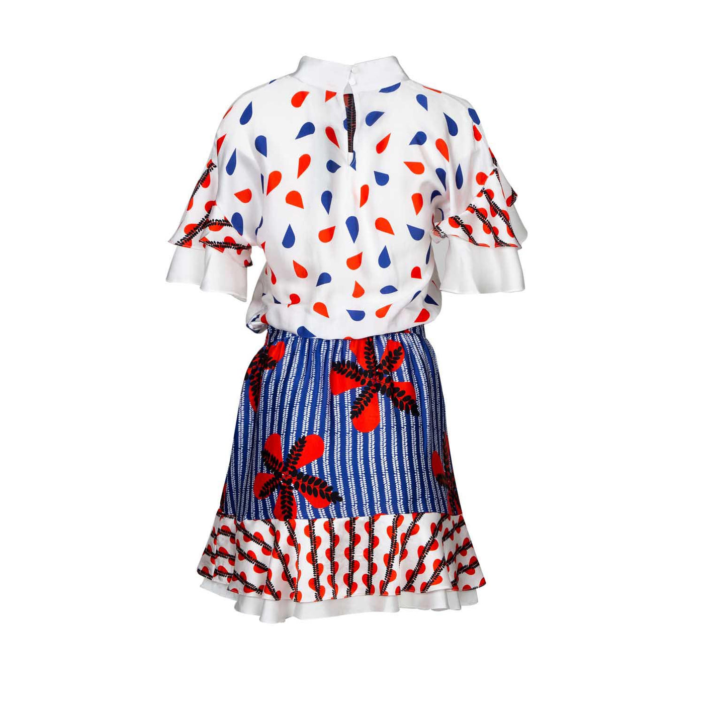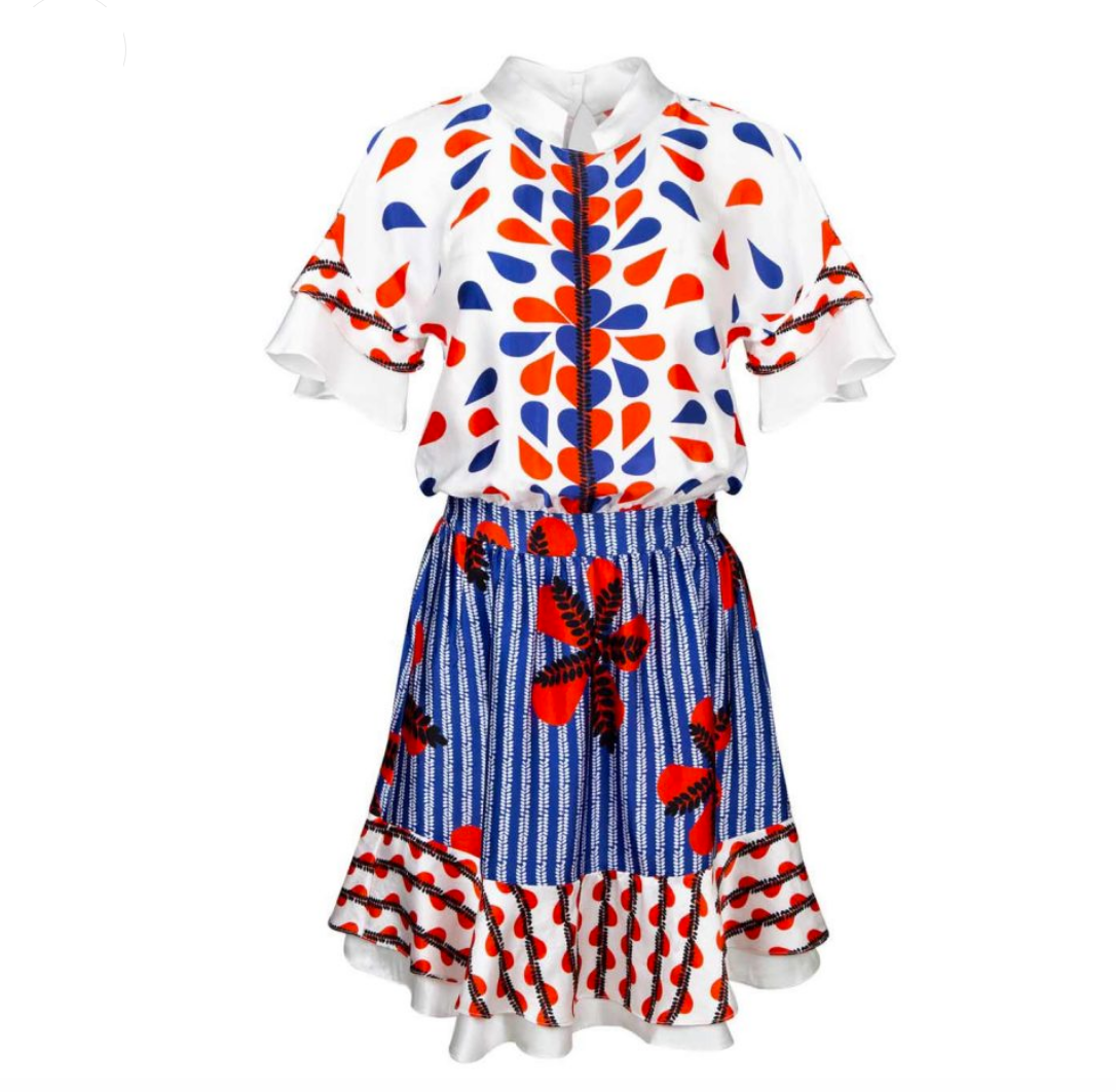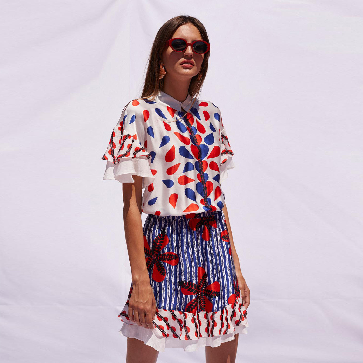 A 100% premium pure Silk, custom printed dress with ruffled playful sleeves.