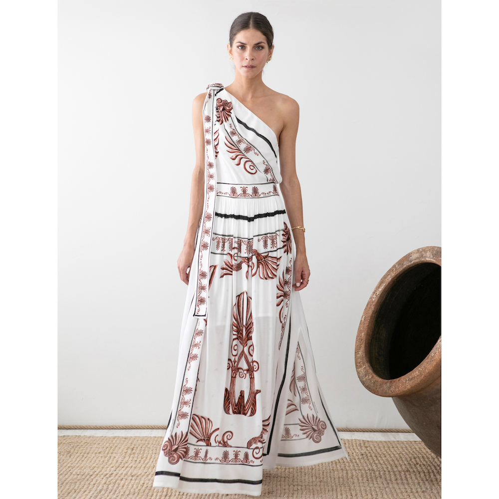 An elegant one shoulder blouse featuring a long band which can be worn as a shoulder feature long or as a bow..or as a belt. The hand illustrated Akrokeramo design is by Greek artist Zeta Papdo. The Akrokeramo is an architectural detail on classical style Athenian rooftops.The flowing skirt is sold separately.