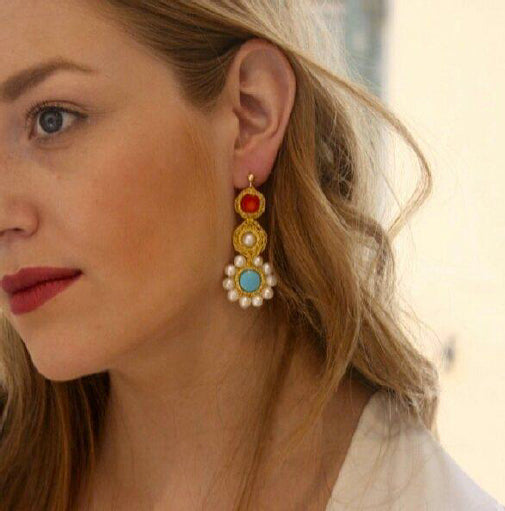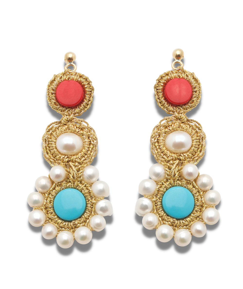 Handcrafted earrings feature a traditional crochet technique. This statement pair also feature selectively sourced semi-precious turquoise and coral stones framed by fresh-water pearls. Each piece is uniquely handcrafted, therefore no two pieces will be exactly identical.