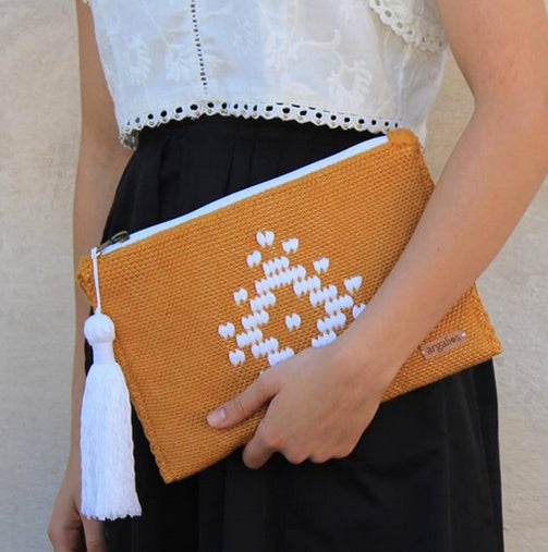 Argalios create hand-woven clutches using traditional artisinal methods with a 19th century Cretan Loom. Each clutch takes up to 3 days to handcraft, from start to finish.