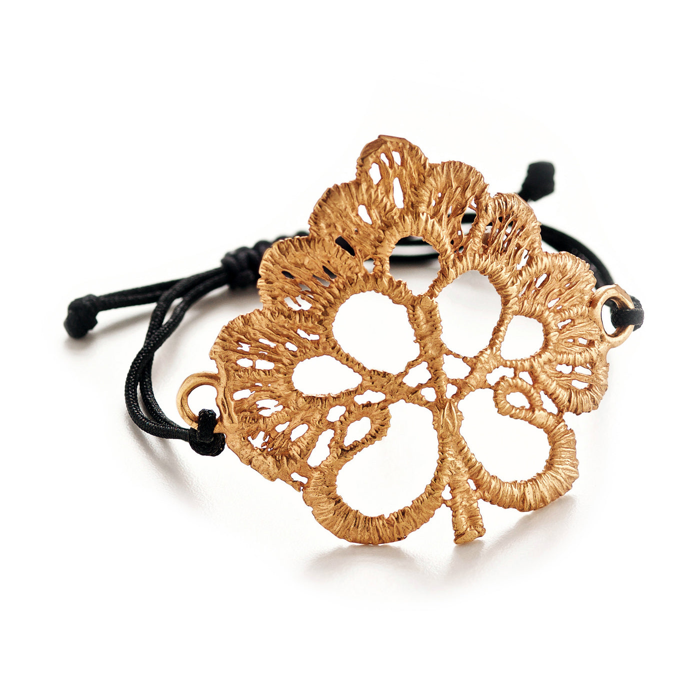 Handcrafted gold-plated bracelet featuring a floral lace feature in hammered rose gold. Made using the centuries-old 'lost wax' jewellery crafting method, dating back to the 3rd millennium BC.