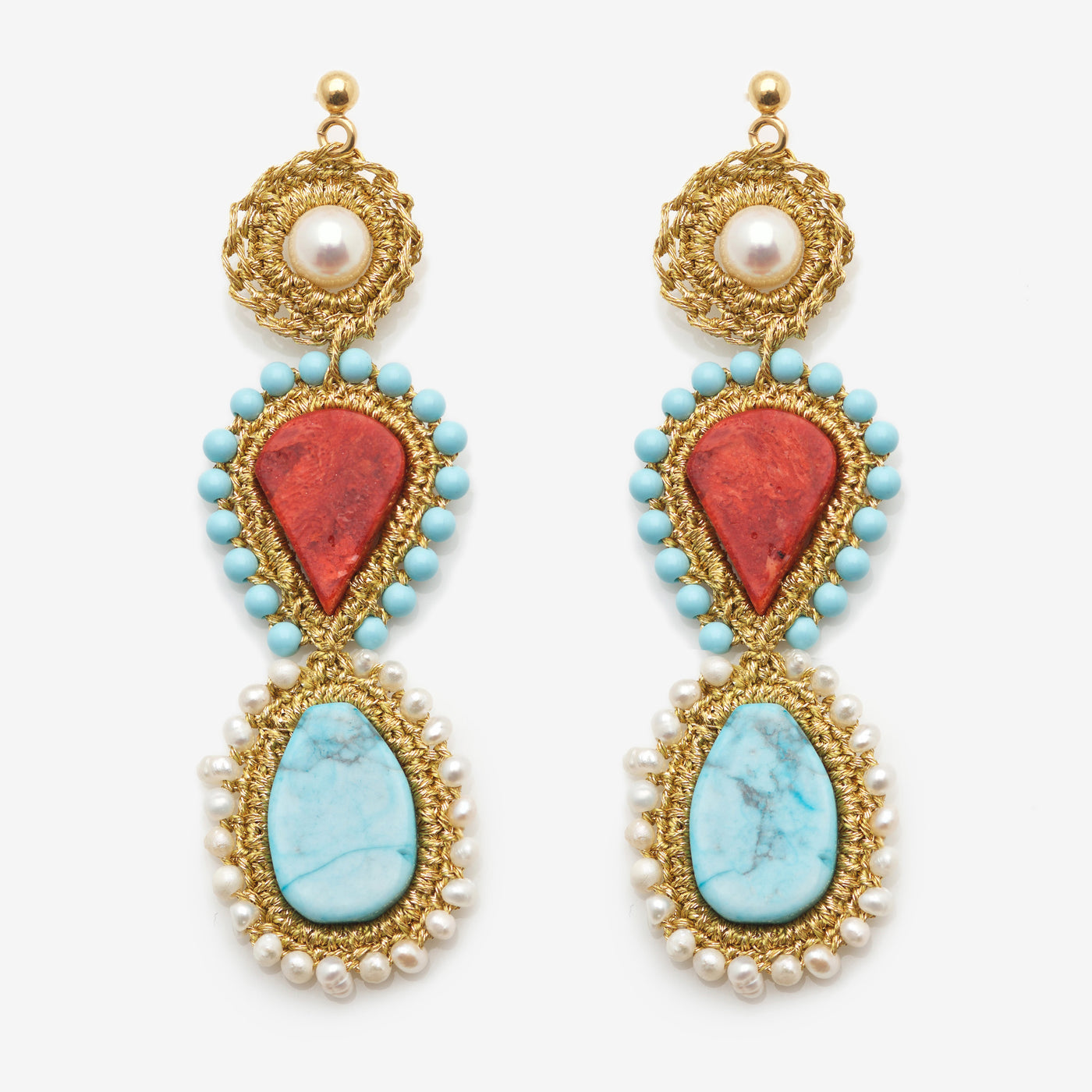 Sofia Papakosta earrings are entirely hand-crafted using an intricate traditional hand crochet technique. These earrings are beautifully embellished with selectively sourced semi-precious stones, such as Turquoise and apple Coral drop stones and freshwater pearls, framed with micro pearls.