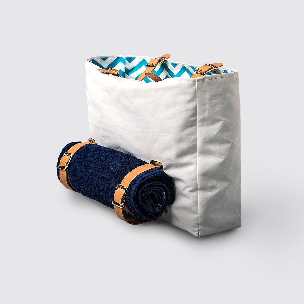An extra large beach bag with waterproof lining to keep the water out of the inside and clever towel holding straps on the outside.