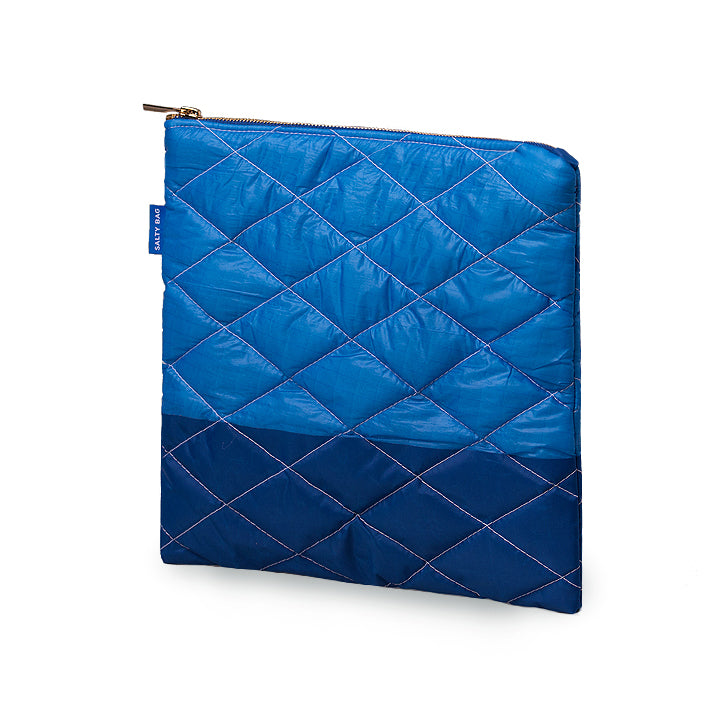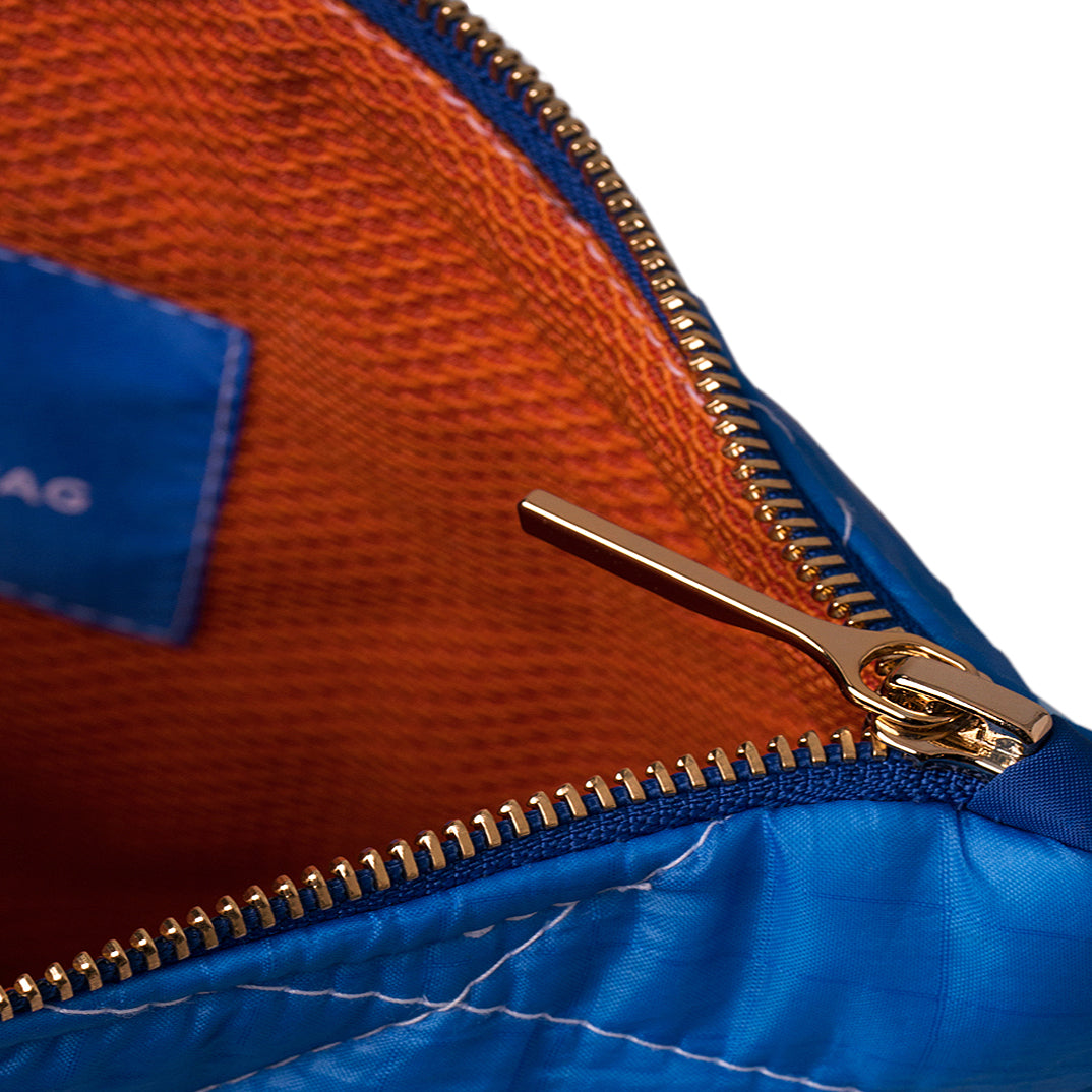 An upcycled, quilted soft touch clutch with a two tone blue finish. Designed to fit all your day to day essentials. Every clutch has a story. It will arrive with a unique number relating to the distance sailed and seas it sailed around the world!
