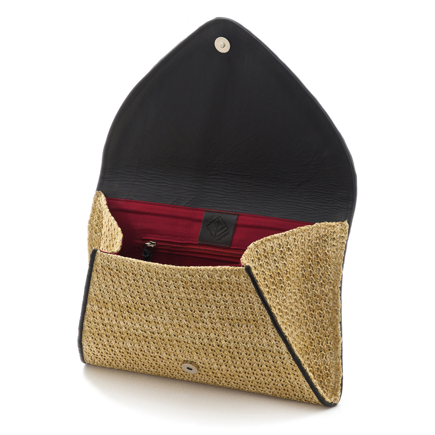 This premium envelope clutch bag is meticulously handcrafted from plaited premium polished raffia. Featuring the finest lambskin leather lining and leather piping. The Iride de Portu, clutch is spacious with a lined interior. Made entirely by hand, no two bags are identical. Limited pieces.