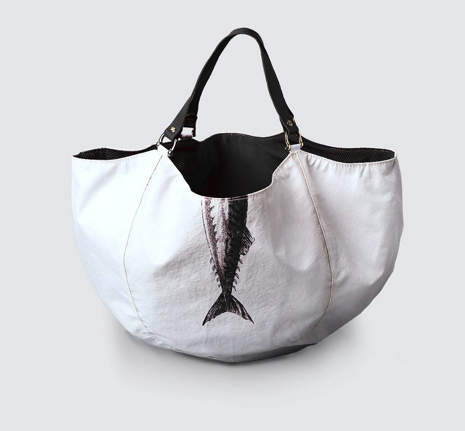 A very spacious upcycled bag take to the beach or to work. Featuring a hand-painted silkscreen print of a mackerel, by a leading Greek print artist TIND (Manolis Angelakis). Each bag has a story. Your bag will arrive with its own number which will relate to the distance sailed, the race it may have participated in and seas it sailed around the world.