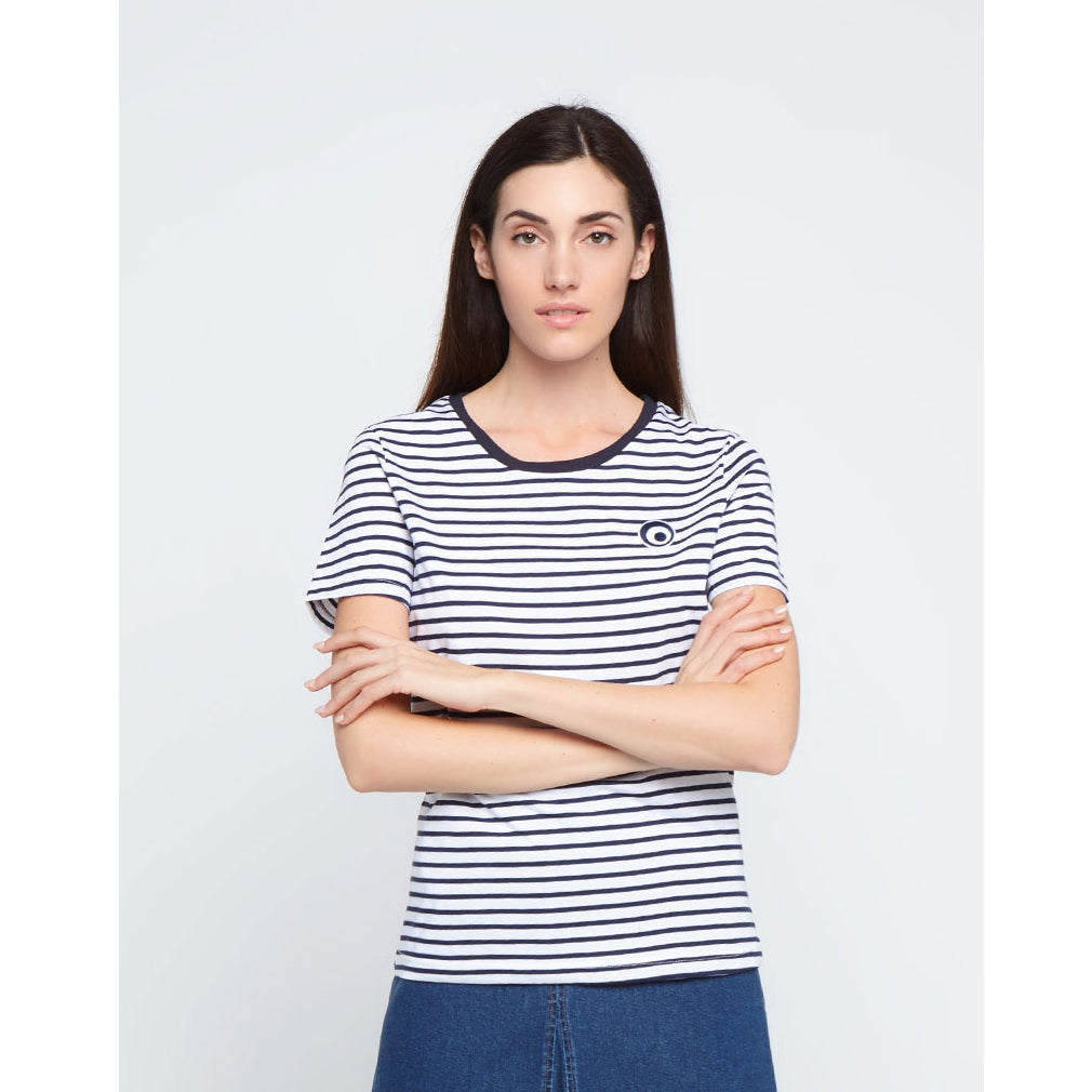 A classic Breton stripe short sleeve T-shirt. Made with a soft touch cotton and jersey mix and features an embroidered evil-eye.