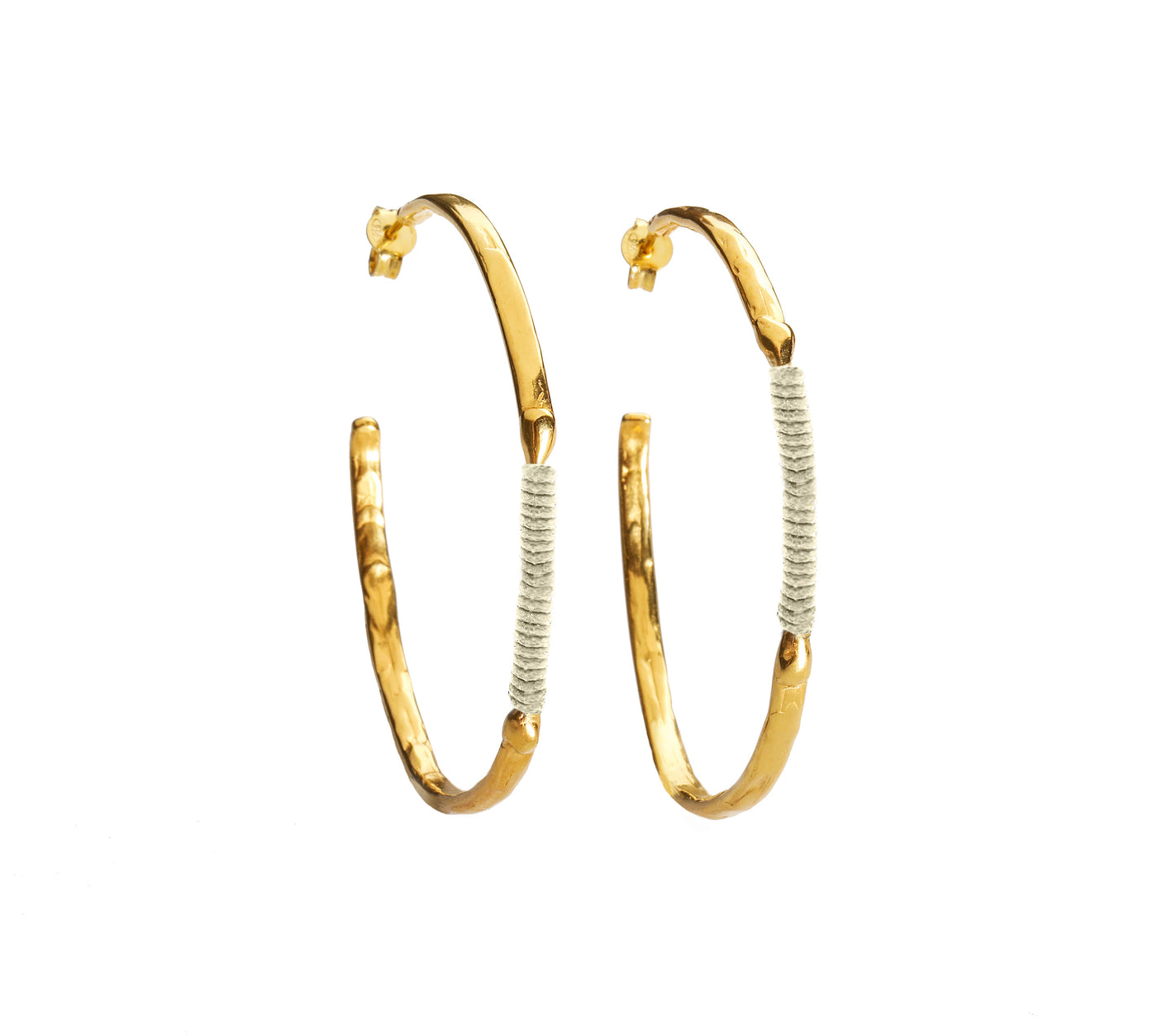 These elegant hoop earrings, and feature a solid hammered finish with an ivory cord wrapped along the base for a touch of playfulness.