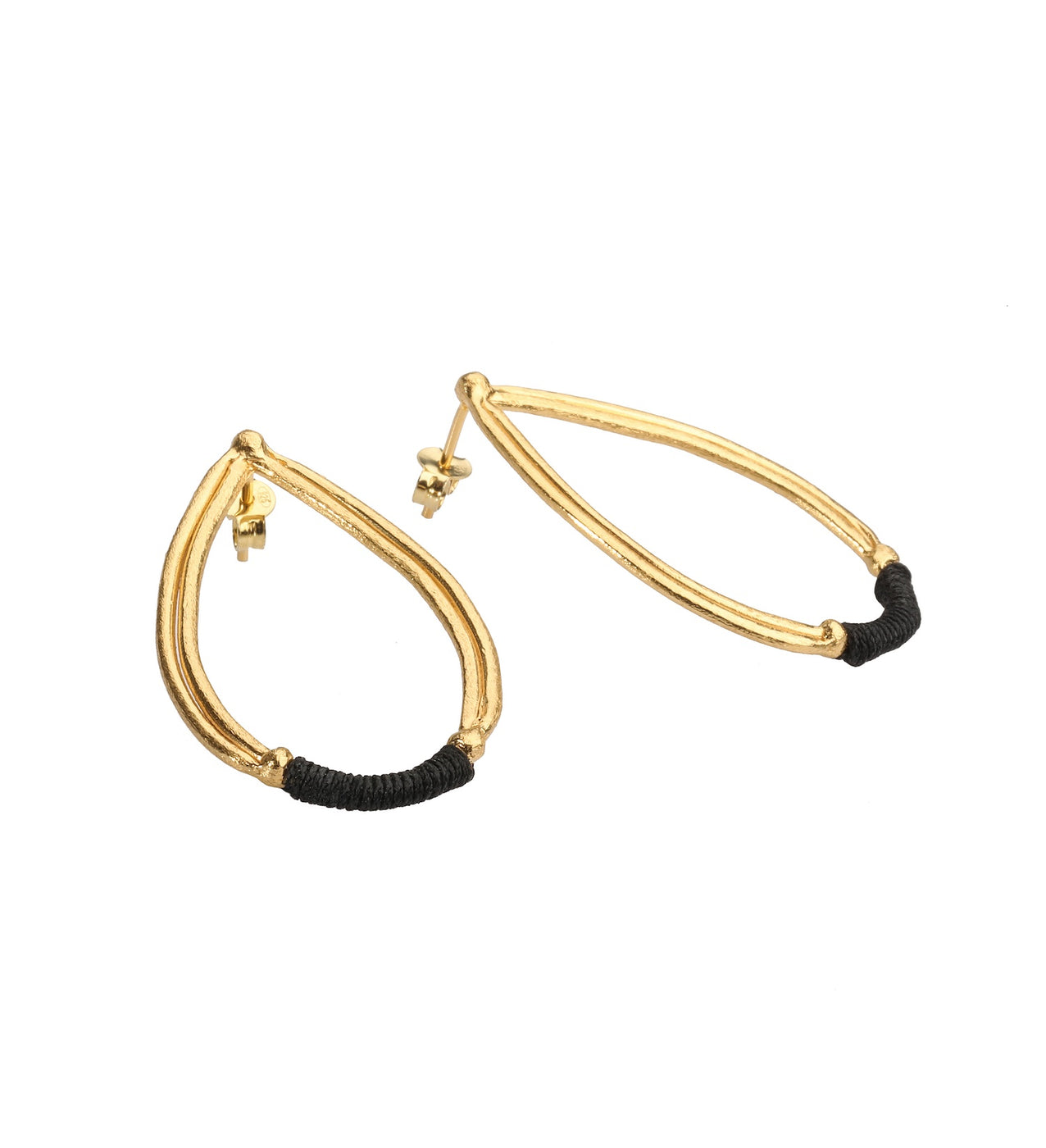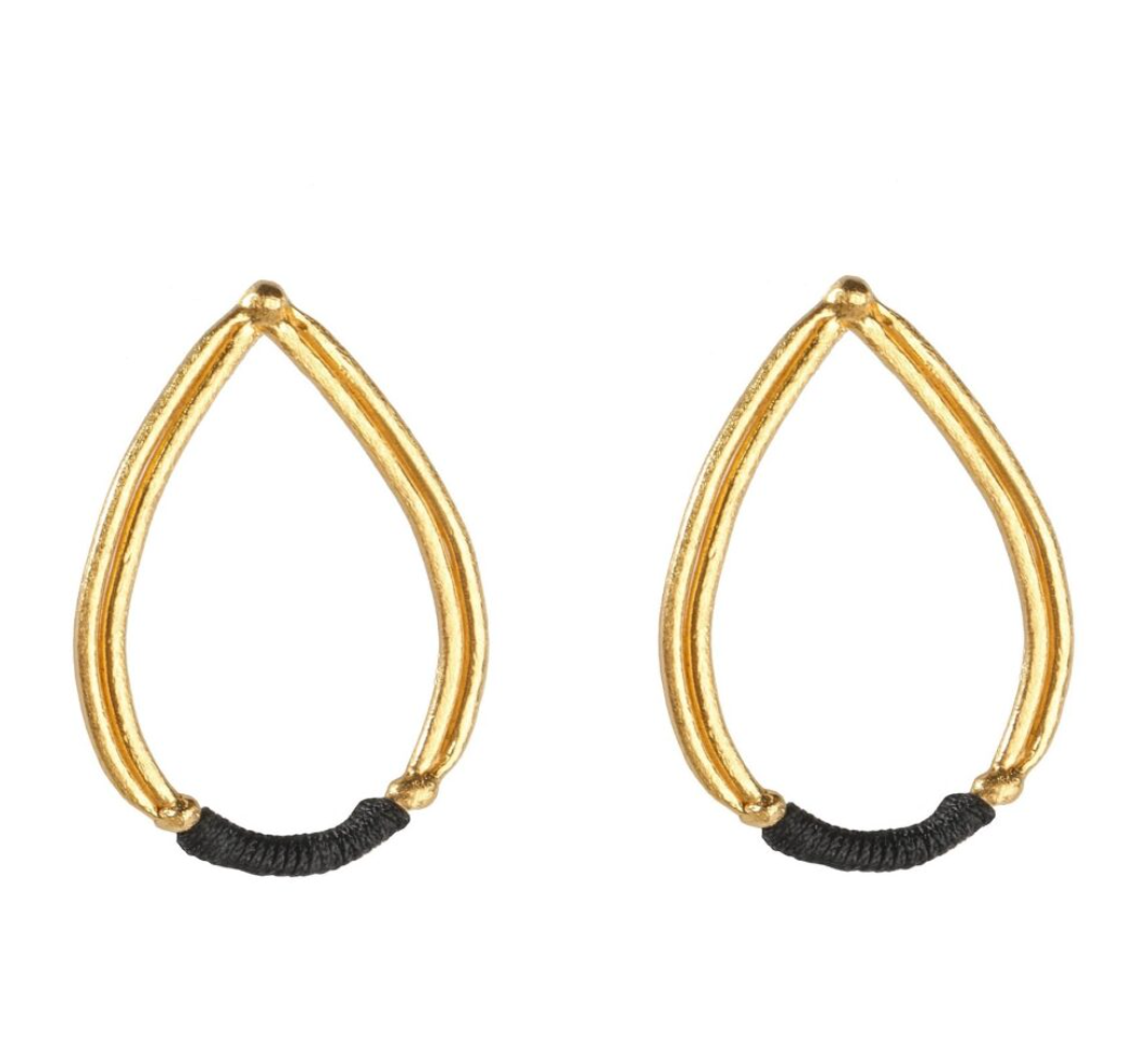 These elegant, striking tear drop shaped earrings, and feature a solid hammered finish with a black cord wrapped along the base for a touch of playfulness.