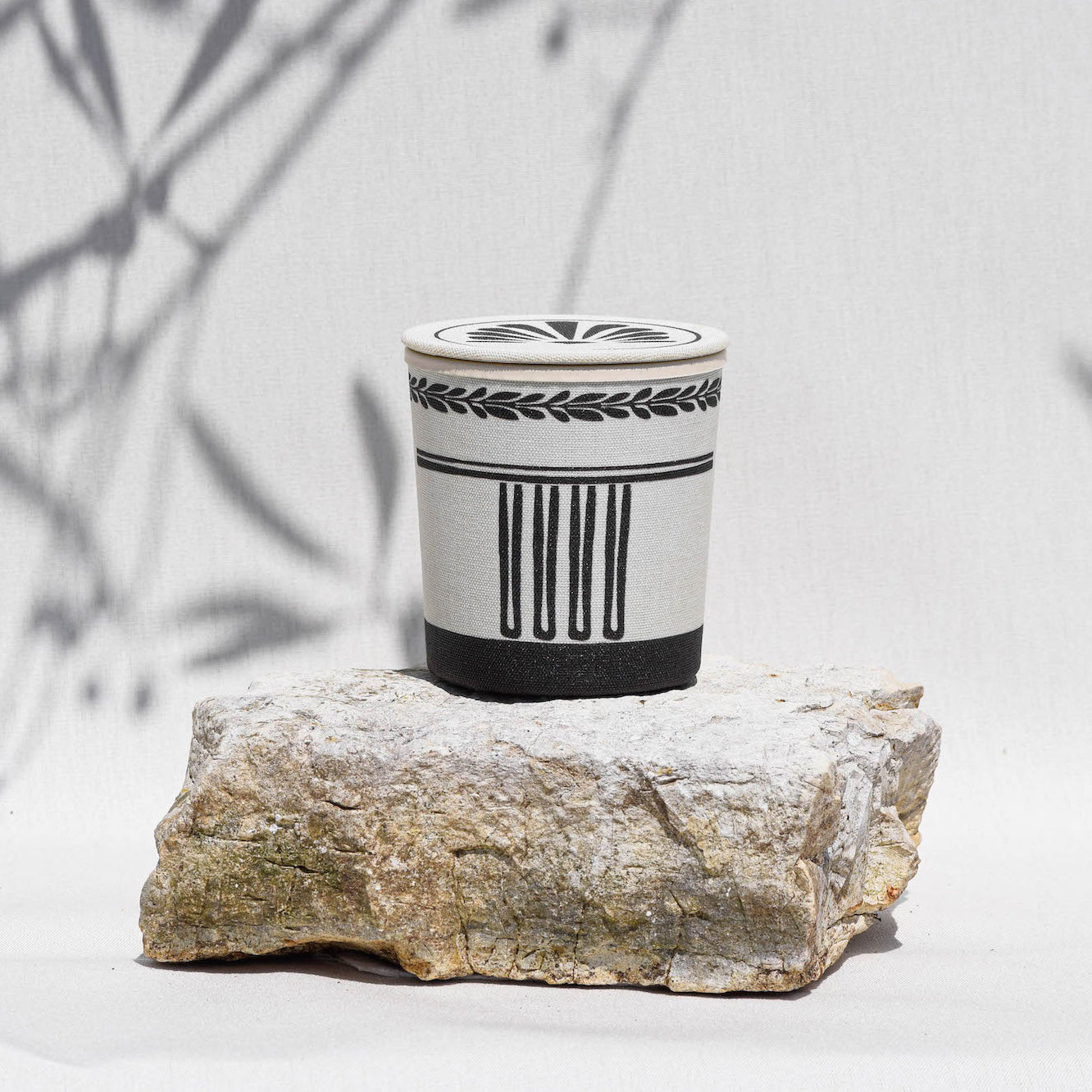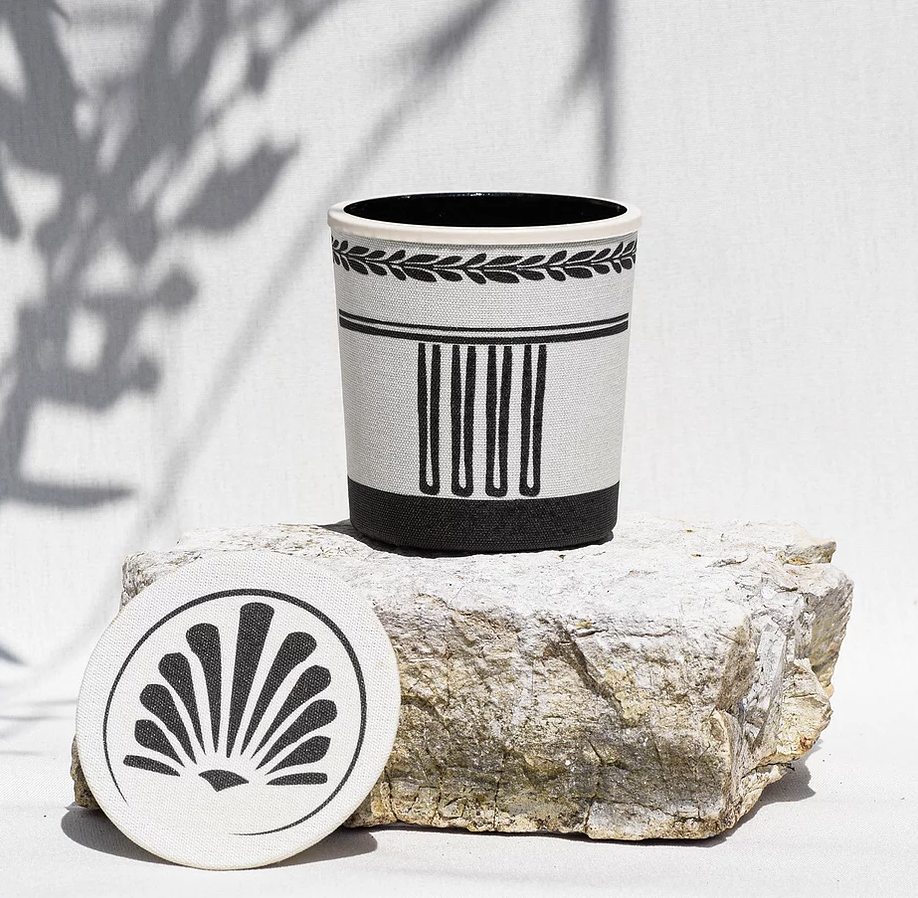 This luxurious wild fig and warm deep amber scent calls to mind the Mediterranean.The unique artistic design is printed on linen fabric reflects the Classical period of Ancient Greek Art (499 BC - 323 BC). Once the candle burns down, the cylindrical pot can be re-used as a keepsake.