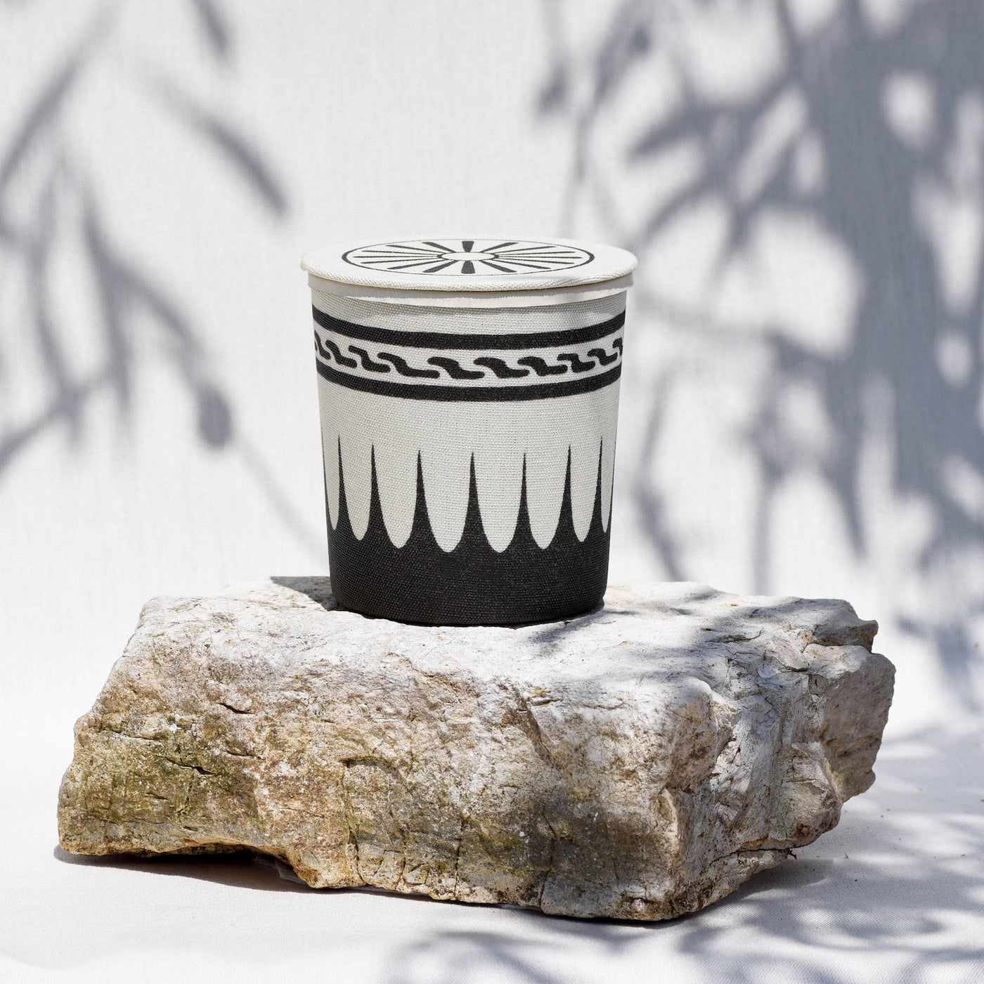 This luxurious wild fig and warm deep amber scent calls to mind the Mediterranean. The unique artistic design is printed on linen fabric reflects the Archaic period of Ancient Greek Art (750 BC - 480 BC ). Once the candle burns down, the cylindrical pot can be re-used as a keepsake.