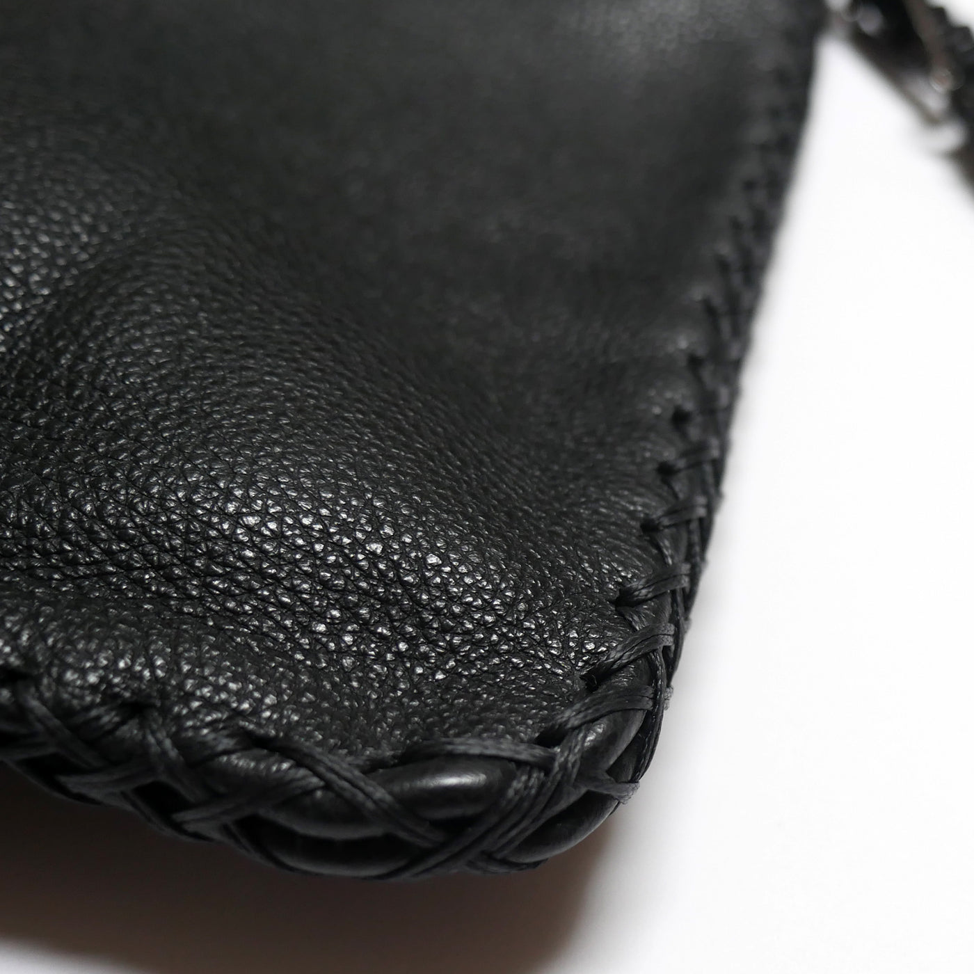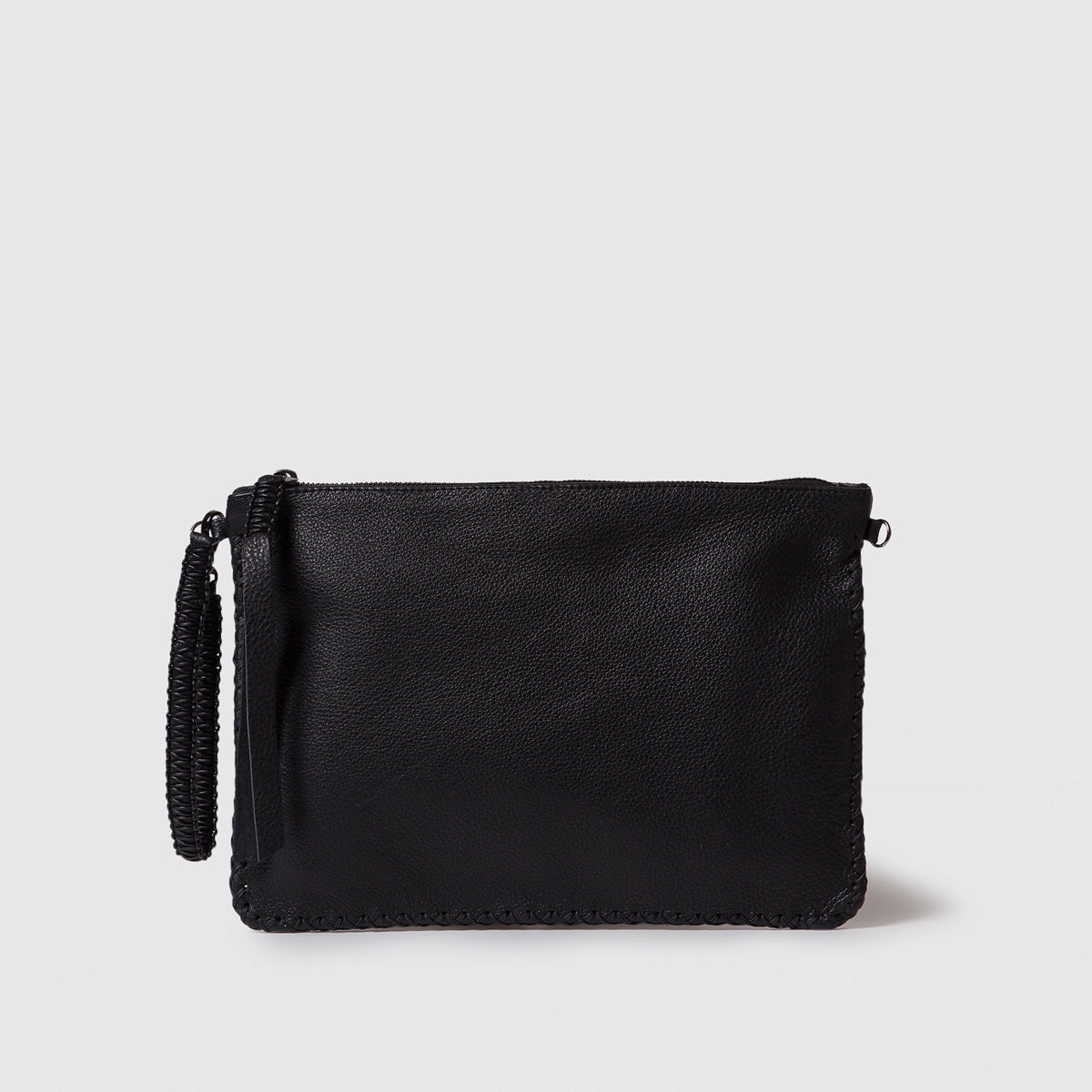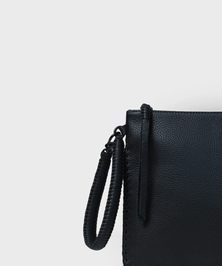 This classic supple grained leather Pochette is lovingly hand cross-stitched throughout. It is the perfect companion for any occasion. A deceptively spacious leather interior to carry your essentials. The removable woven wrist strap can also be worn as horizontal strap for an evening clutch.