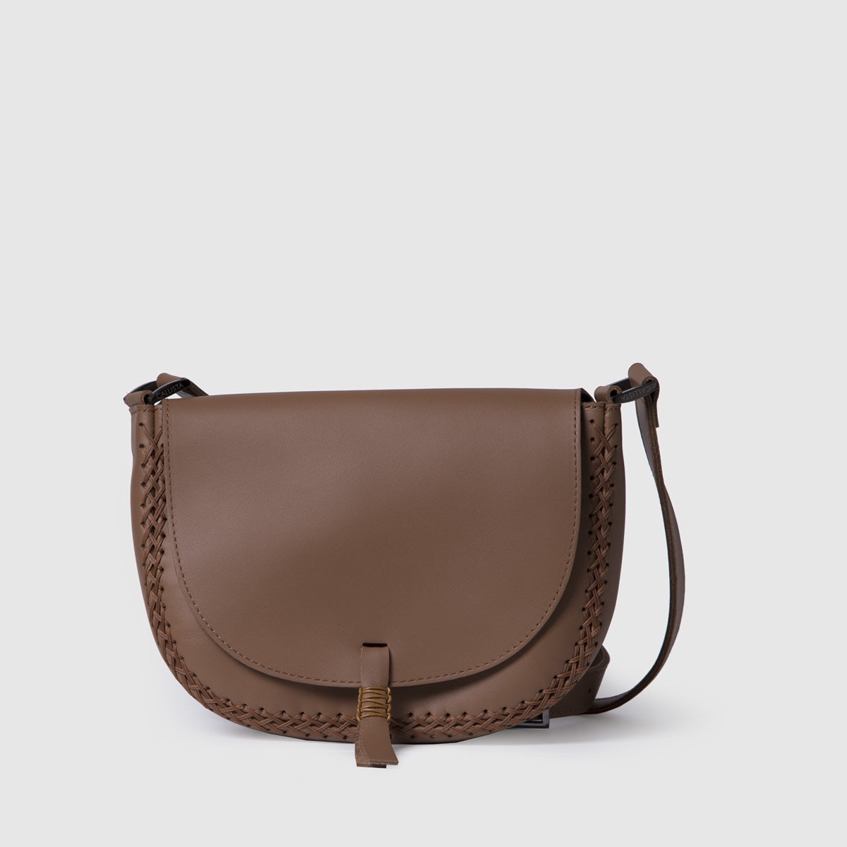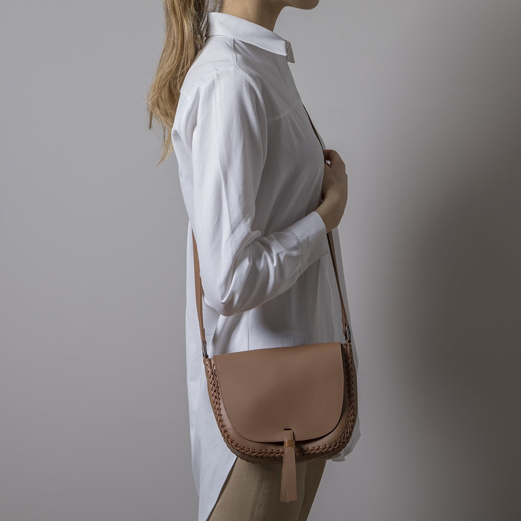 This sleek leather satchel is all you could ask for in a cross-body bag. It boasts a structured saddle design with hand stitched detailing and a distinctive double leather tassel. Perfect for the woman on the go.