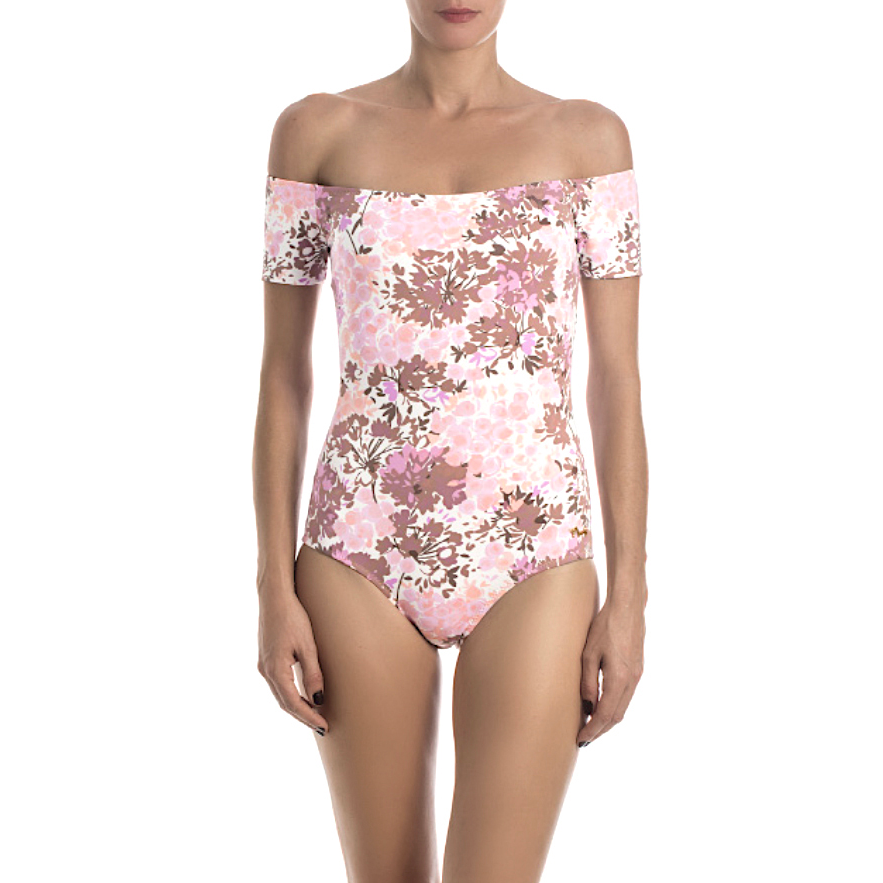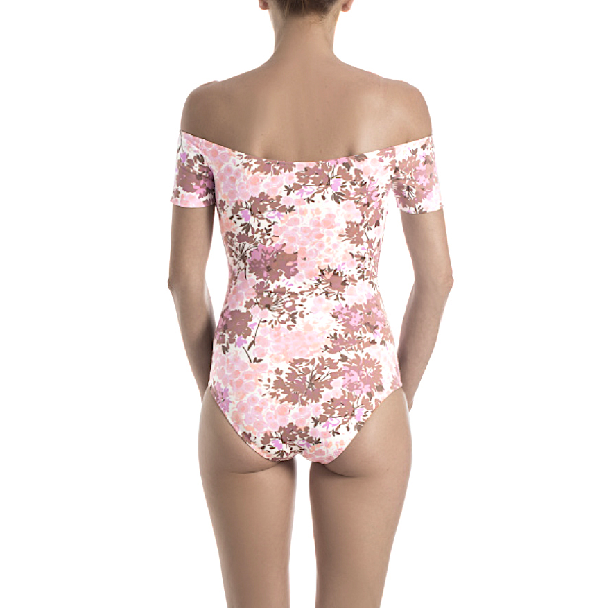 Classic shape off-the-shoulders one-piece and gorgeous floral pattern. High cut at back. Full coverage.