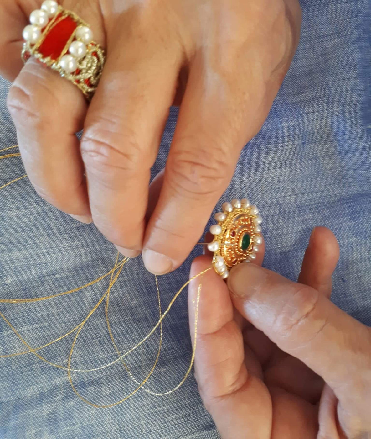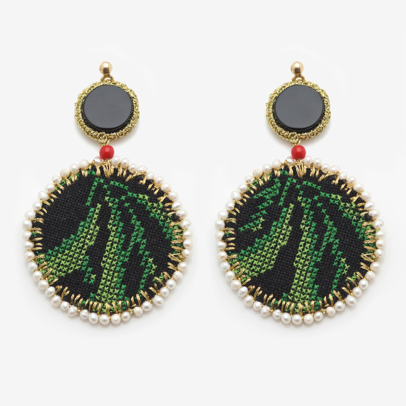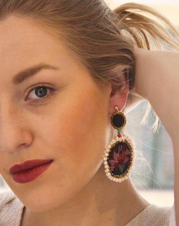 Handcrafted Sofia Papakosta earrings featuring lovingly sourced vintage embroidered fabric, making these earrings truly one of a kind. High quality gold thread crochet, framing selectively sourced black polished stones, joined by a apple coral micro bead and surrounded with micro freshwater Pearls.