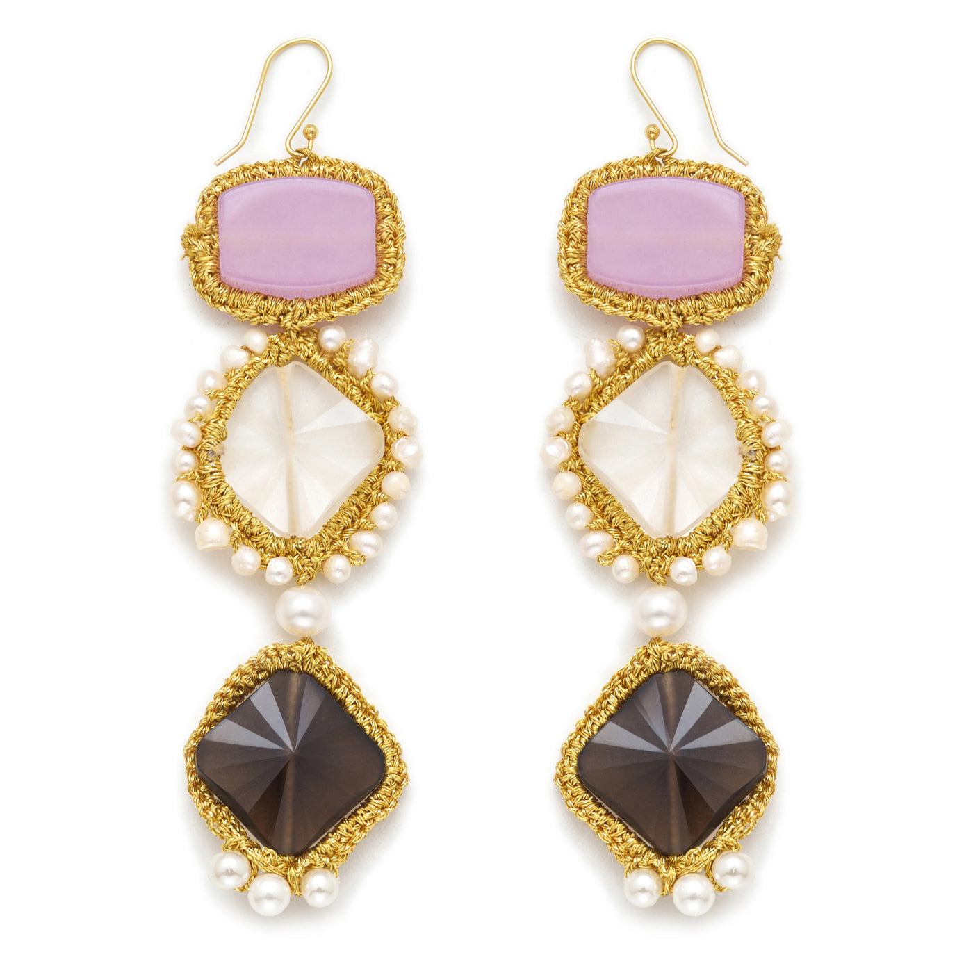 Sofia Papakosta earrings are handcrafted with fine gold-plated crochet. This statement pair features selectively sourced musk, clear and brown semi-precious stones with hand-stitched micro pearls