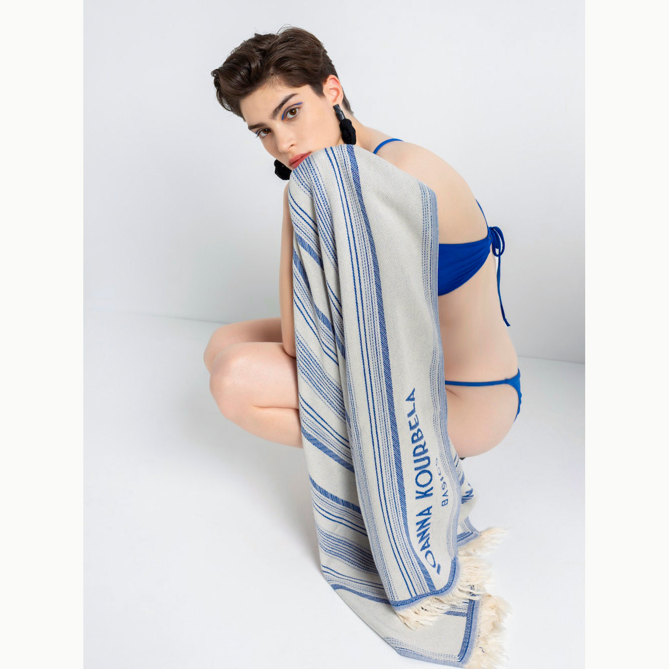 A large lightweight, reversible towel made of 100% organic cotton. Featuring a blue/ ivory stripe design with a soft tassel fringe. The perfect practical summer companion for the beach.