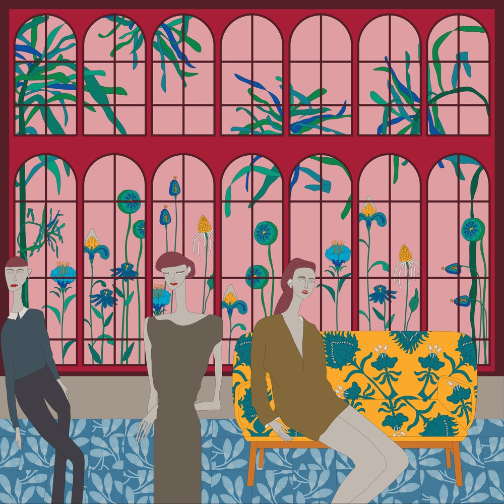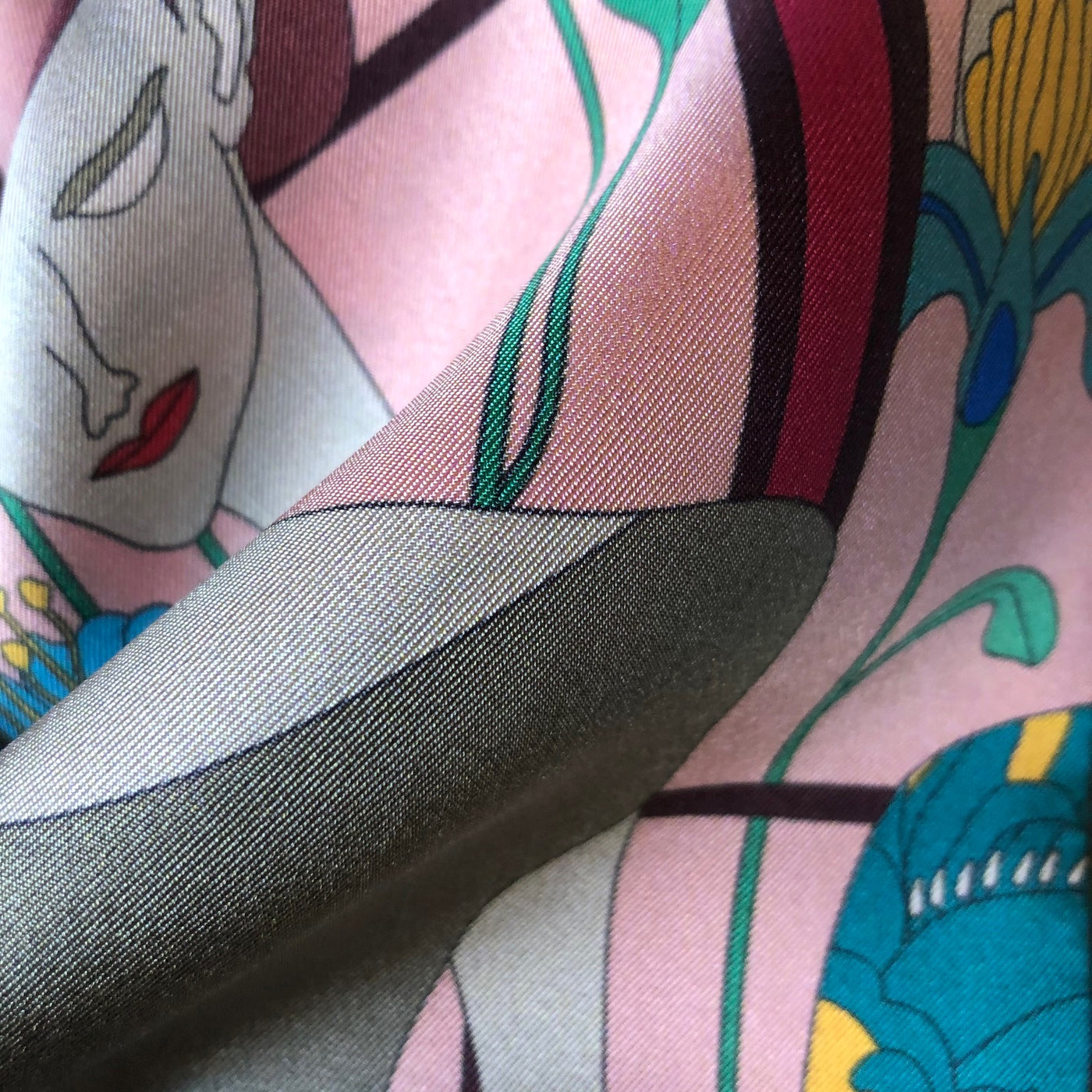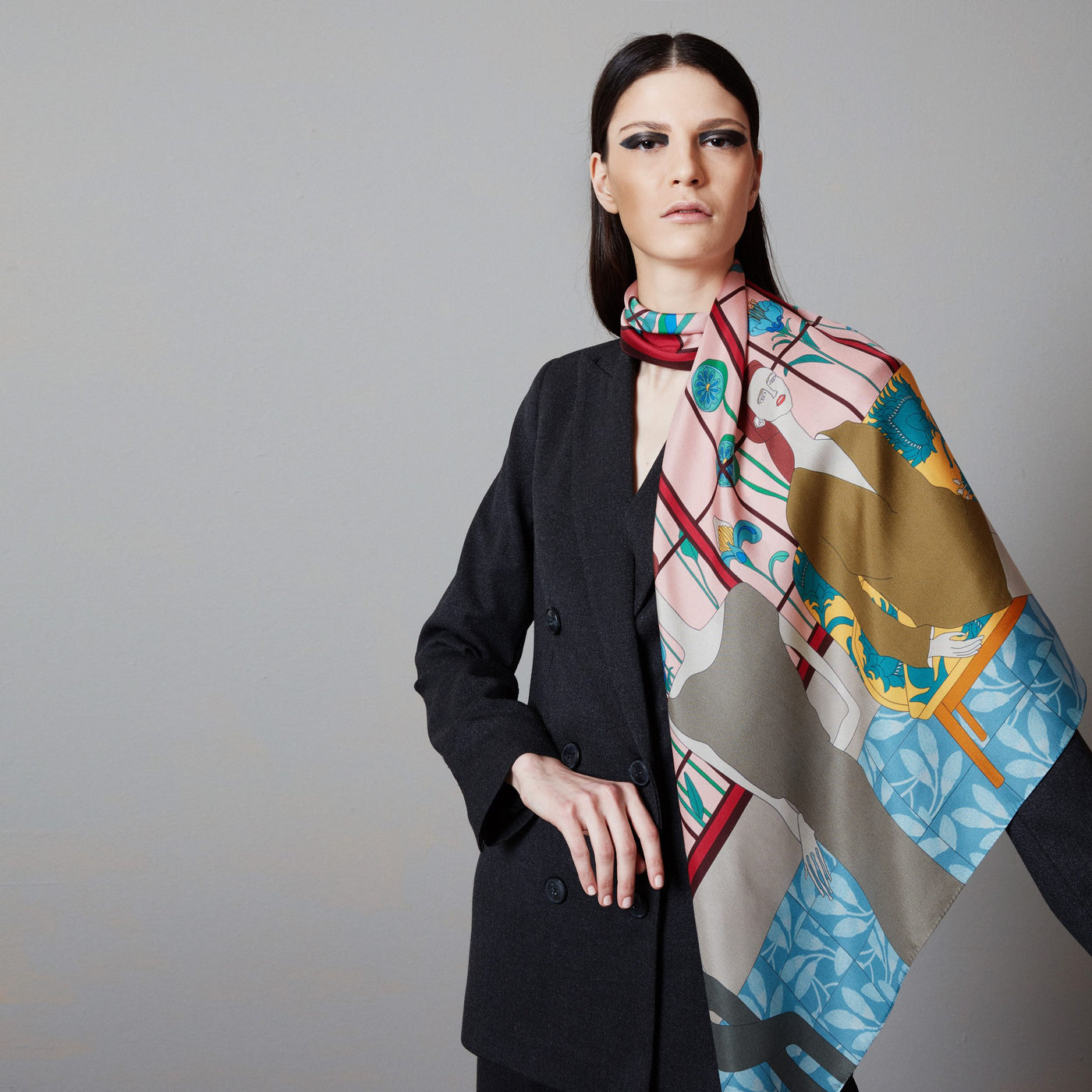 Hand illustrated figurative artwork on a luxurious large silk scarf. The designs are printed digitally and sewed traditionally by hand. The silk is sourced from natural silkworm cocoons within the 19th century old silk producing town called Soufli. Wear a piece of art.