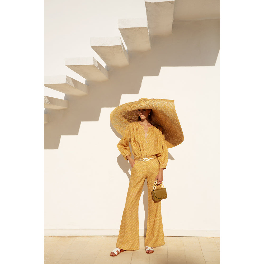 Gorgeous gathered blouse made with luxurious linen, featuring 3/4 sleeves. Pants sold separately.