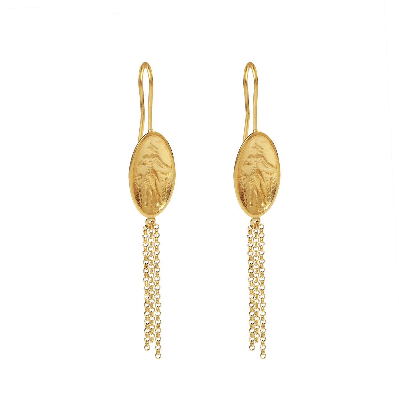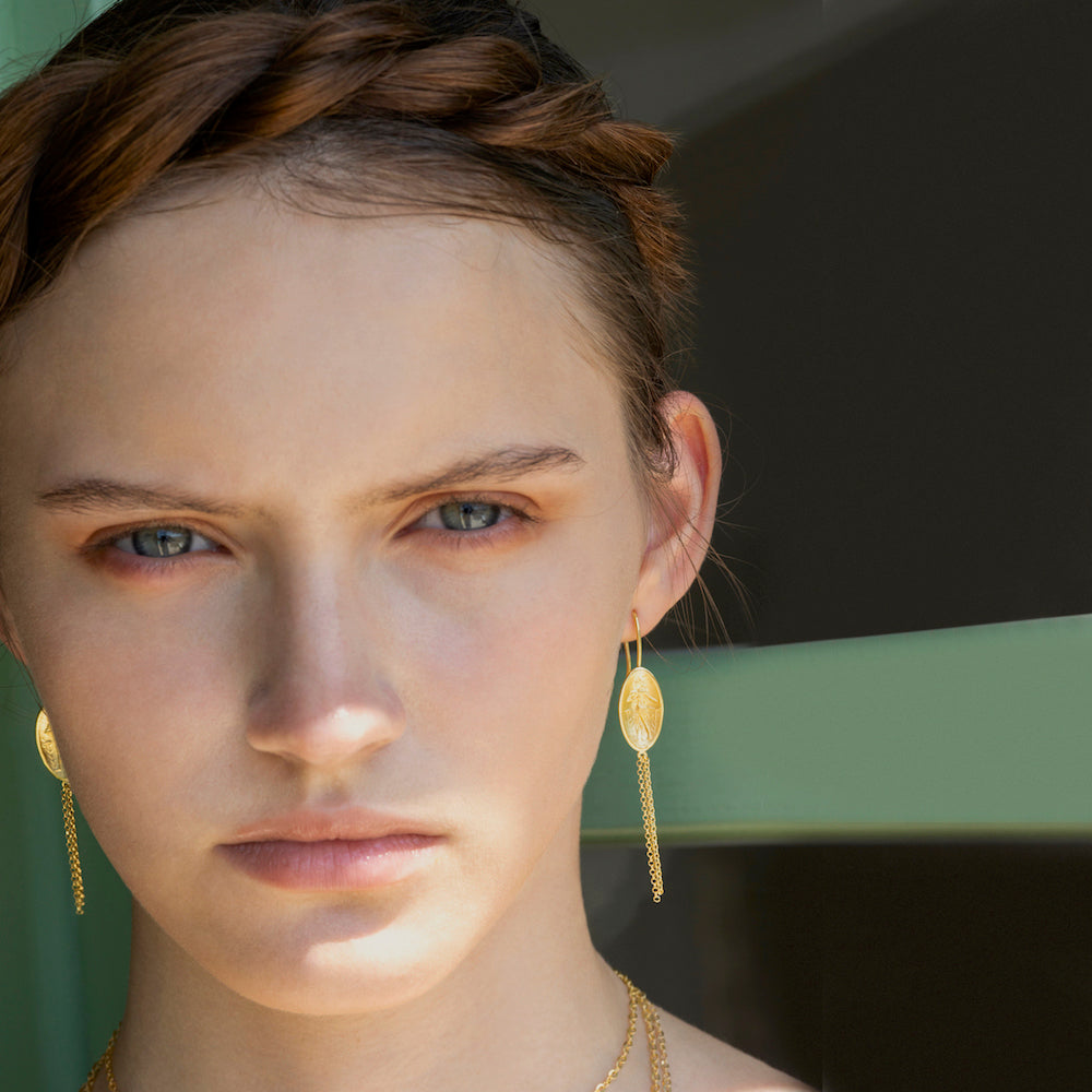 Inspired by a ring from Danai's family, this pair has a concave structure featuring a relief imprint of the goddess Dimitra (the goddess of agriculture and harvest) reflected in Ancient Minoan art. We love the 3 assymetrical and delicate gold chain strands.