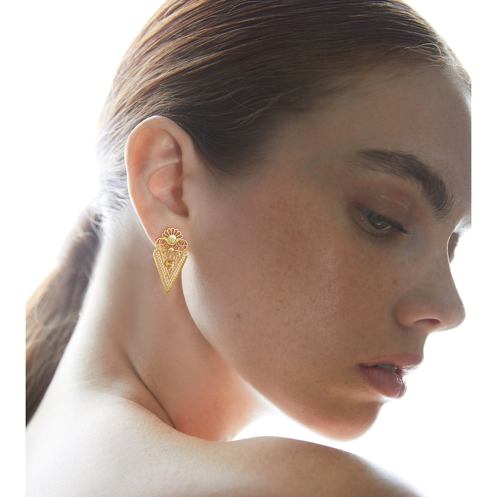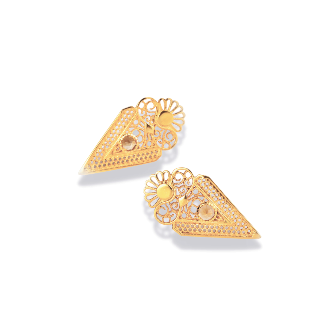 Stunning angular 24k gold earrings featuring 2 yellow citrine stones. The intricate filigree 19th century design is an interpretation of the 'Yiordani'. This is an adornment attached to the collar of bridal gowns from the Mesogeia region in Attica. The original was made up of twelve to nineteen embellishments including scalloping, rosettes, multi-coloured glass stones and coins. Bridal jewellery pieces belonged to the church and hardly any of them were family-owned.