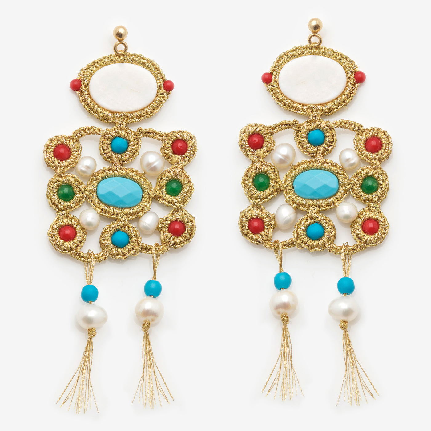Sofia Papakosta's earrings are entirely hand-crafted. Her exquisitely handcrafted earrings are beautifully embroidered and embellished with selectively sourced semi-precious white Agate stones. Turquoise, Green and Coral stones and freshwater Pearls.