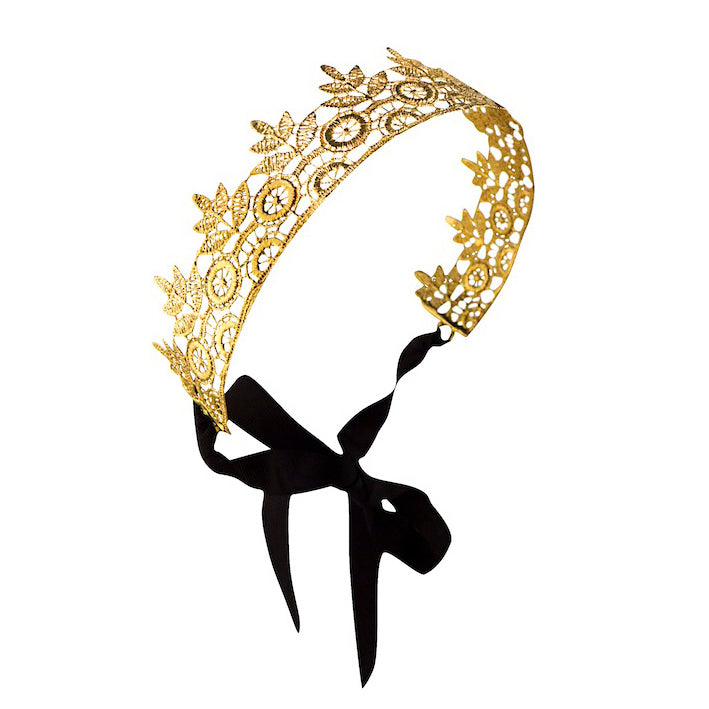 Handcrafted luxurious gold plated lace crown headband crown with leaves and circular pattern lace effect.
