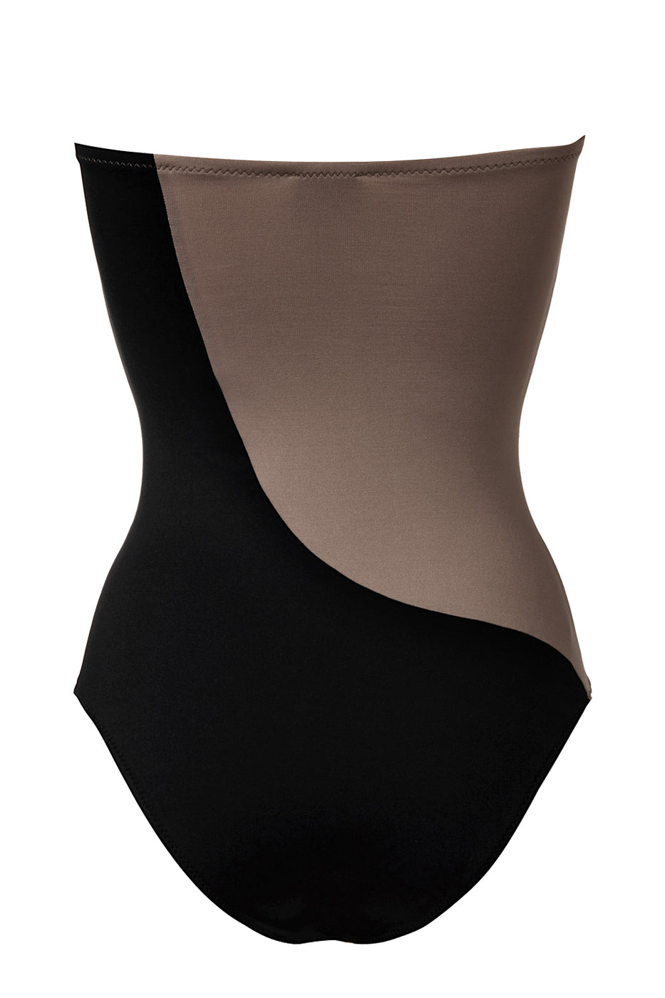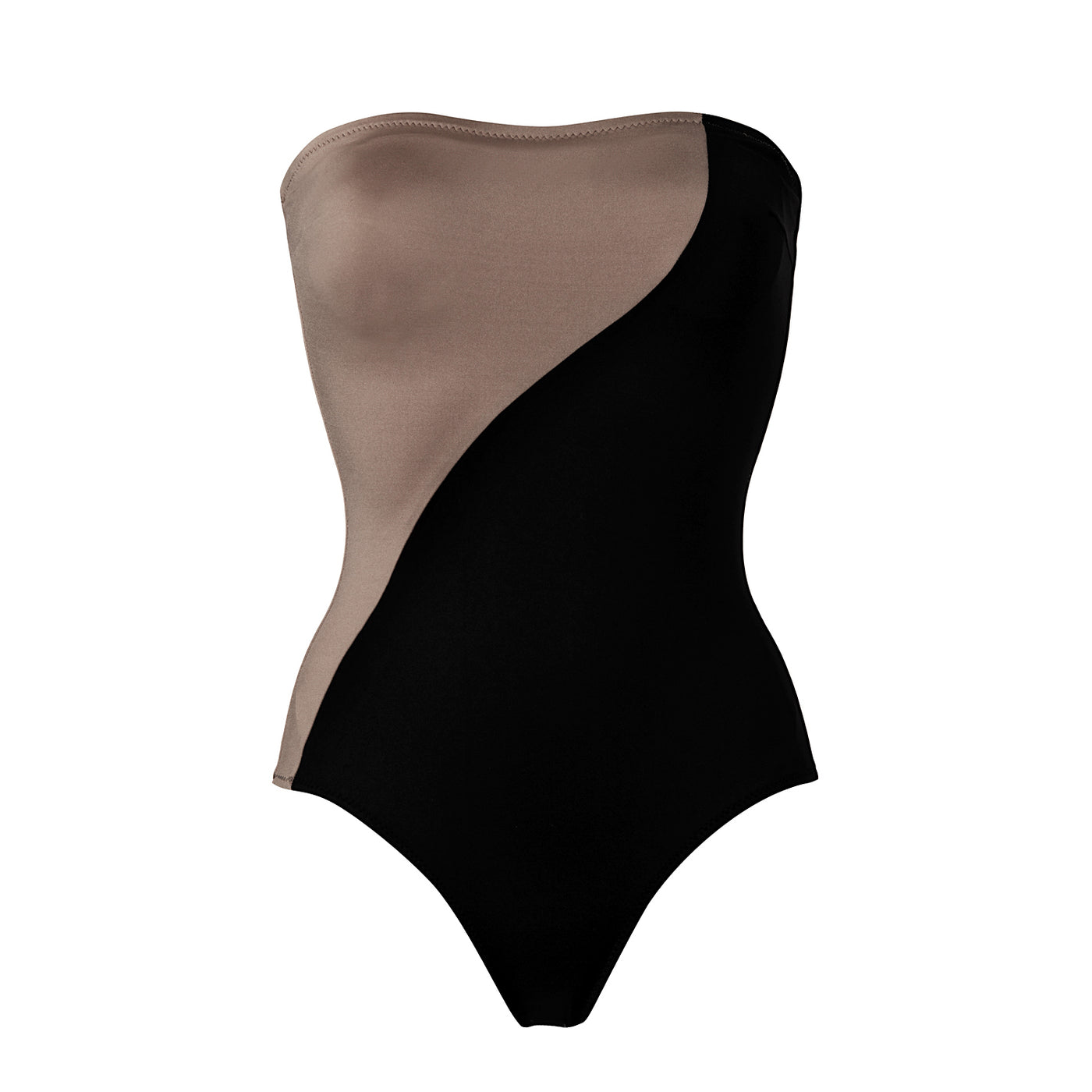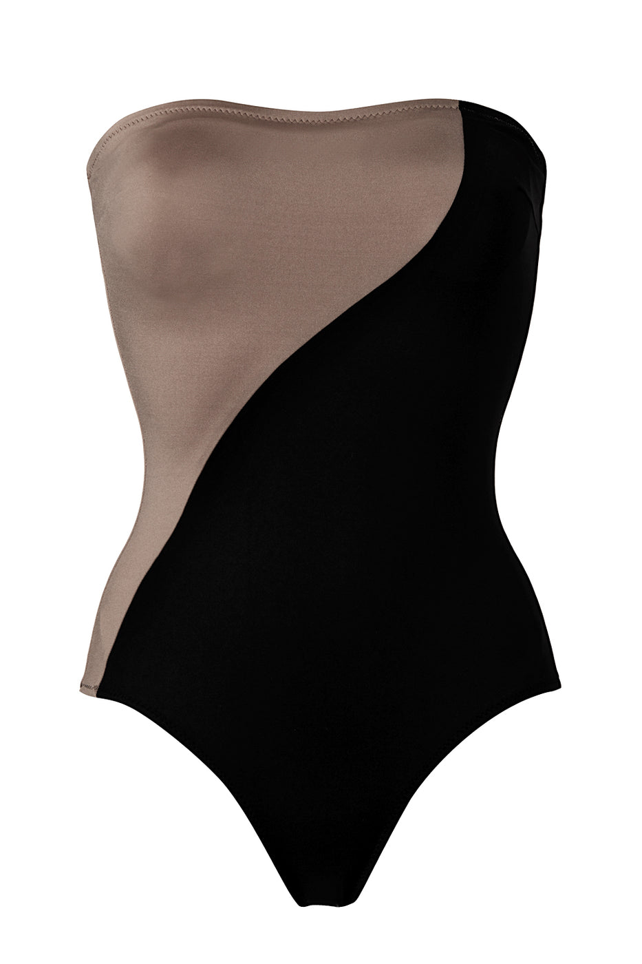Strapless two colour one-piece padded. Premium elasticised at top thick and secure anti-slip and hold and padded. High back. Fully lined.