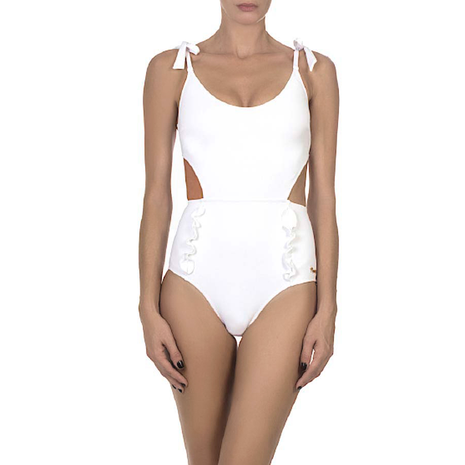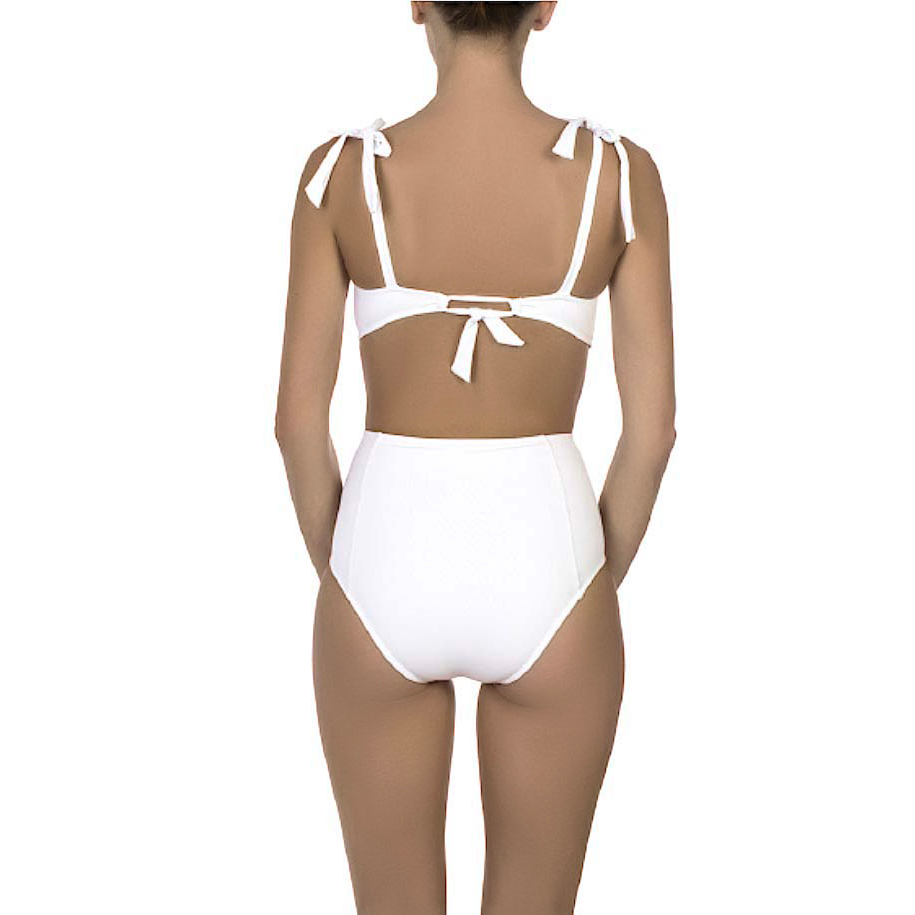 Retro style one-piece scoop neck-line. High waisted cut out front. Self-adjusting thick ties on the shoulders and across back. Medium coverage. Back appears like a Bikini. Vertical ruffle detail at front.