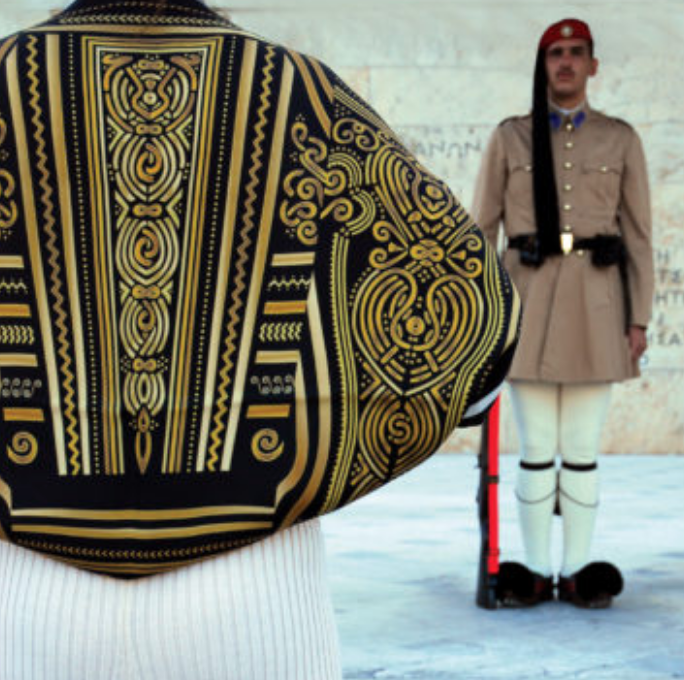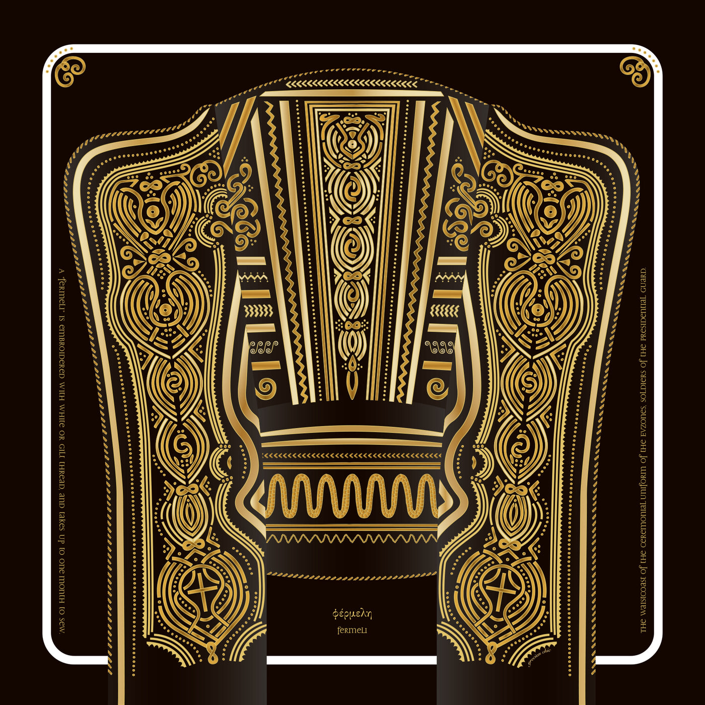 Featuring a fine illustration of the cape as worn by the 'Evzones' - who are the soldiers of the Presidential Guard. Evzones wear a traditional ceremonial uniform which features an embroidered waistcoat called a Fermeli. A Fermeli takes up to one month to sew. The patterns embroidered on a Fermeli symbolise ancient symbols and folklore from regions around Greece, a cross representing Christianity, and the stripes indicate the military rank of the wearer.