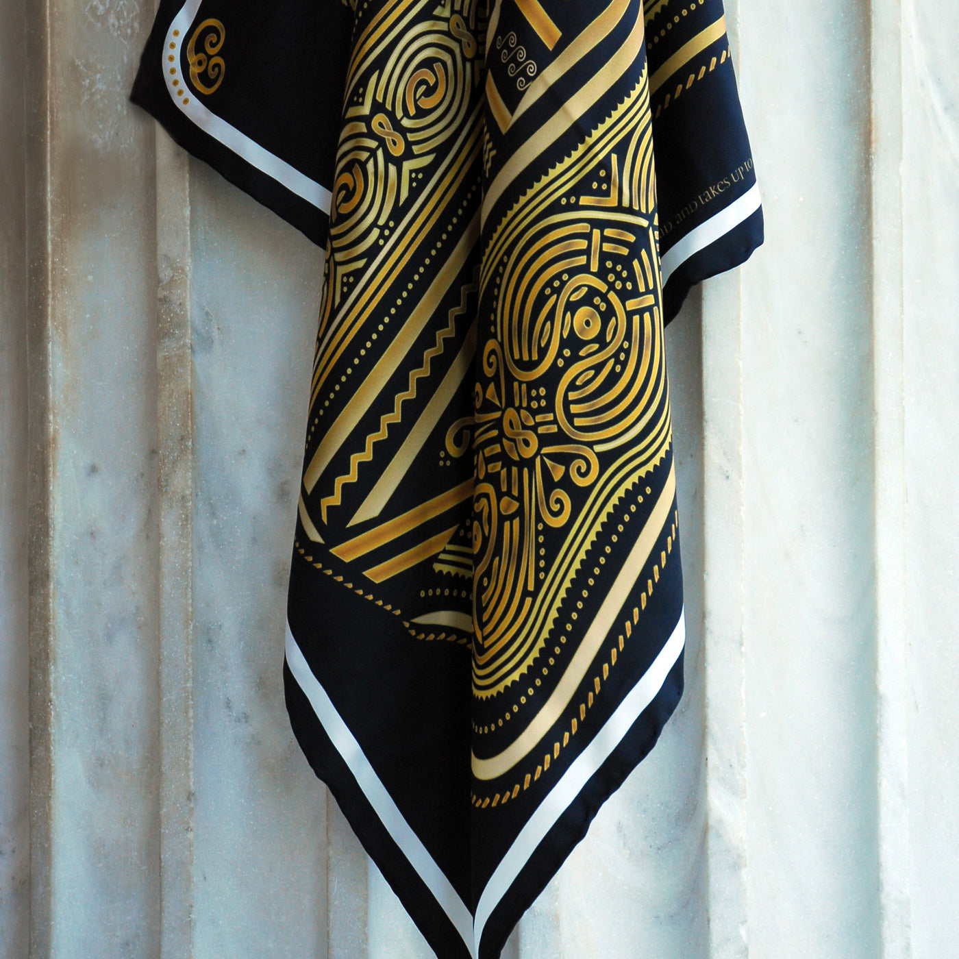 A luxurious 100% silk twill scarf with hand-rolled hemming and featuring a hand illustrated Greek soldiers waistcoat. This is an ideal accessory to complement your style. It can be worn many different ways: around your neck, as a belt, as a top, as a headscarf, or frame it on your wall!