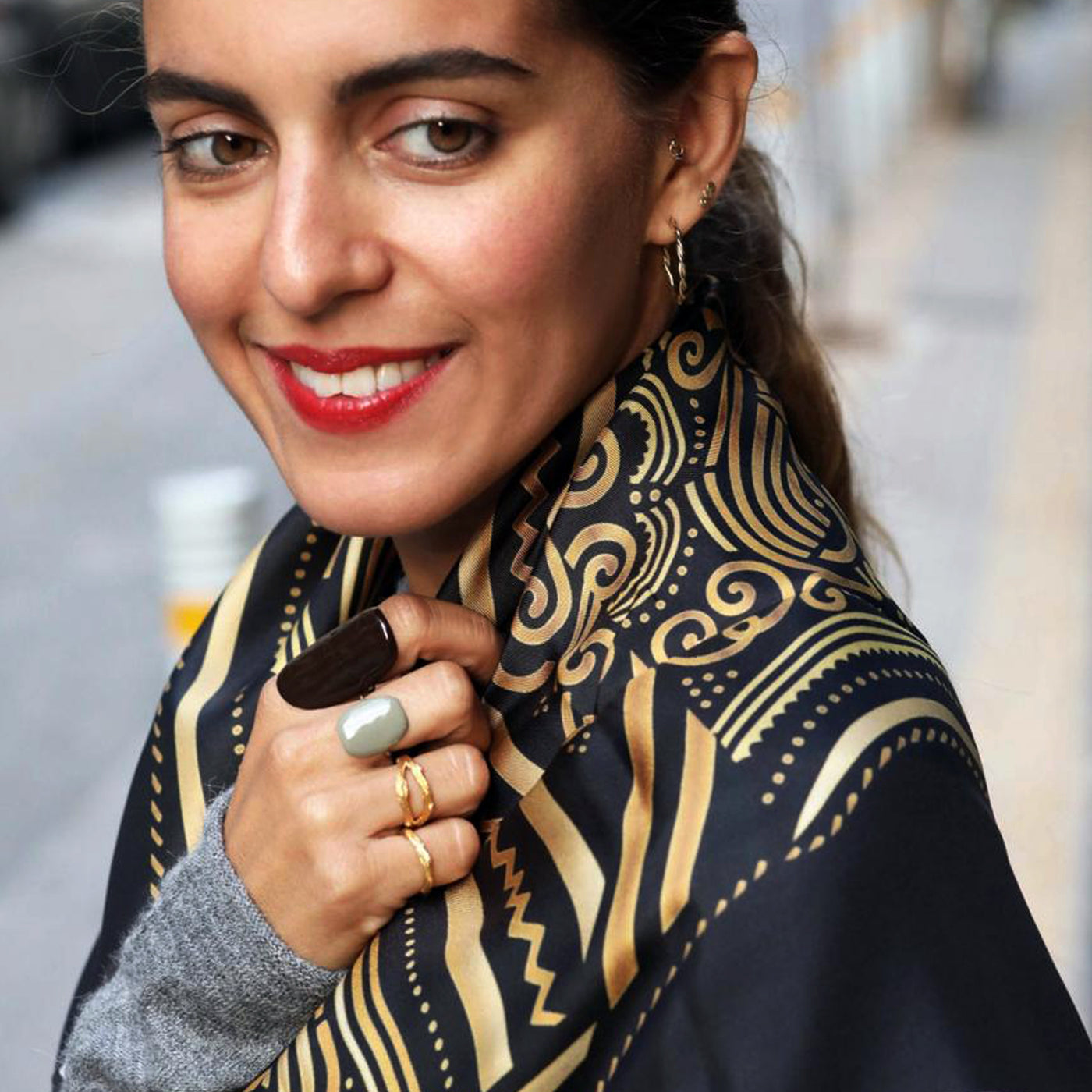 Grecian Chic Scarves are handmade fine silk scarves featuring, hand-illustrated comical motifs and cultural references.