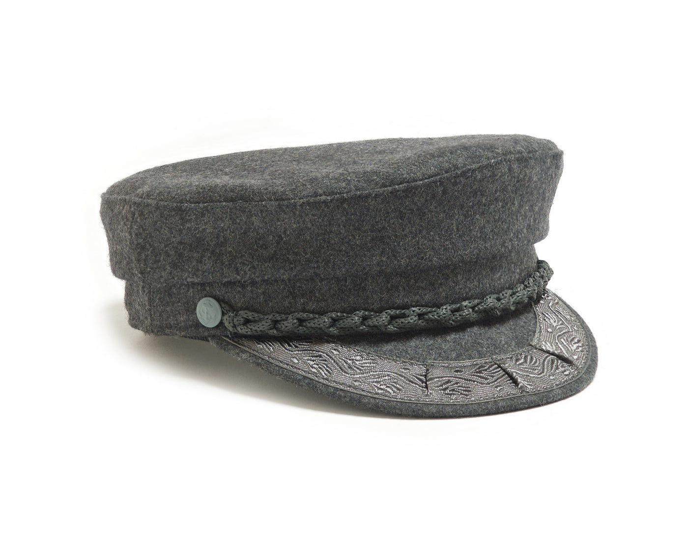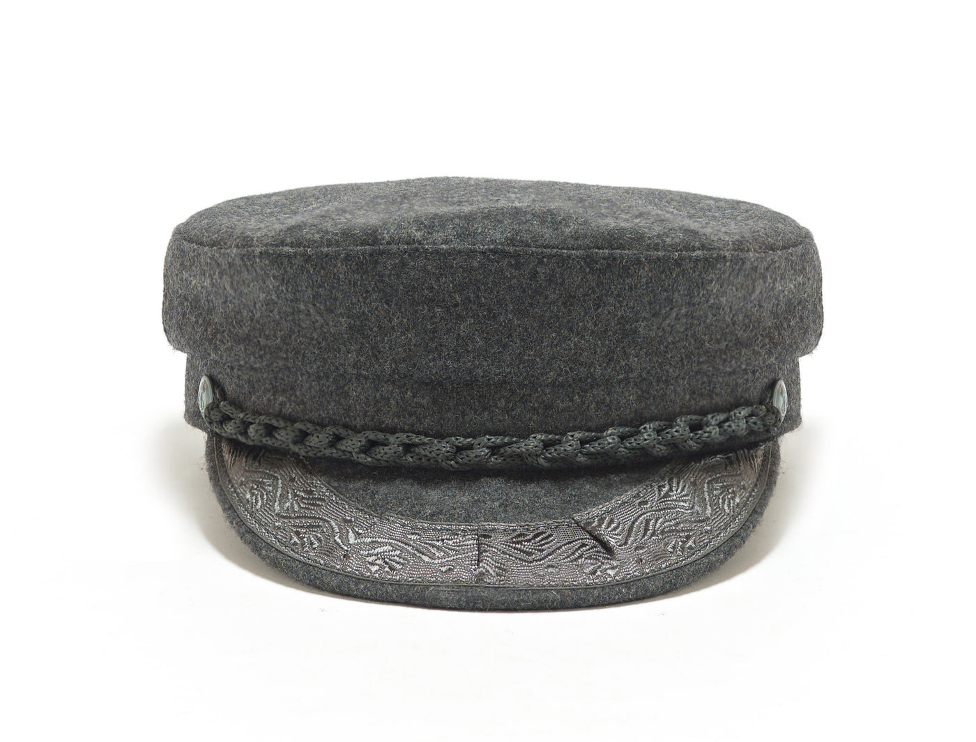 Each hat is constructed by hand, using age-old millinery techniques. Each cap features an embroidered band across the brim, and a plaited loop chain held down with premium quality matt anchor studs.