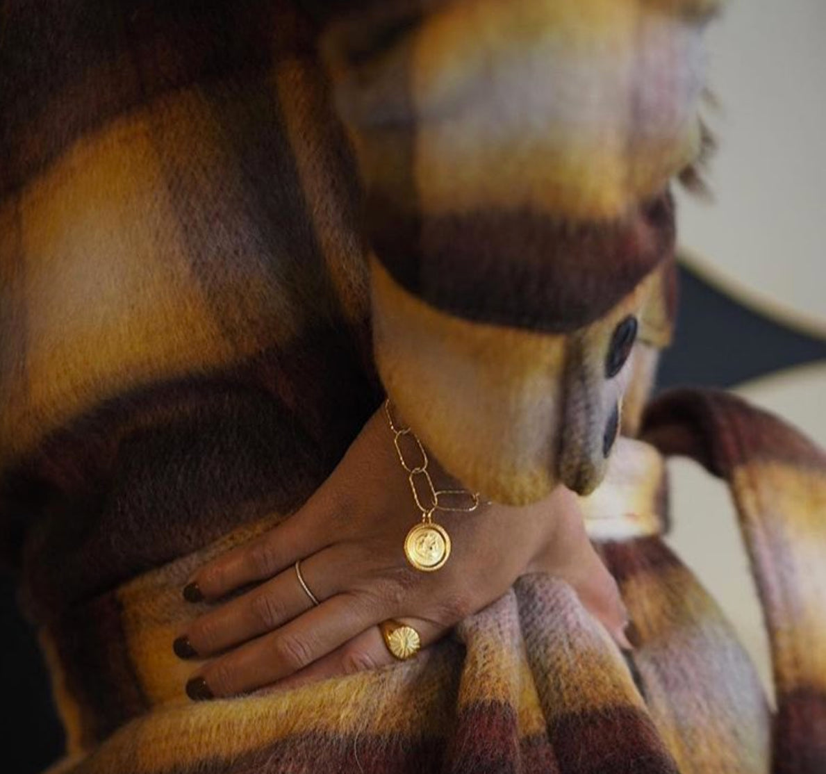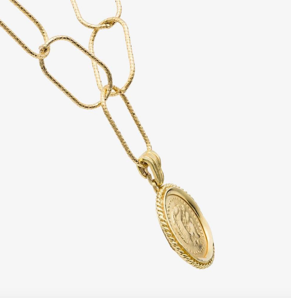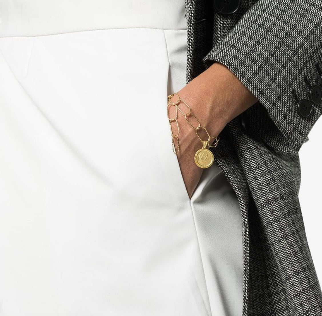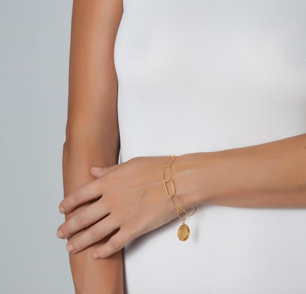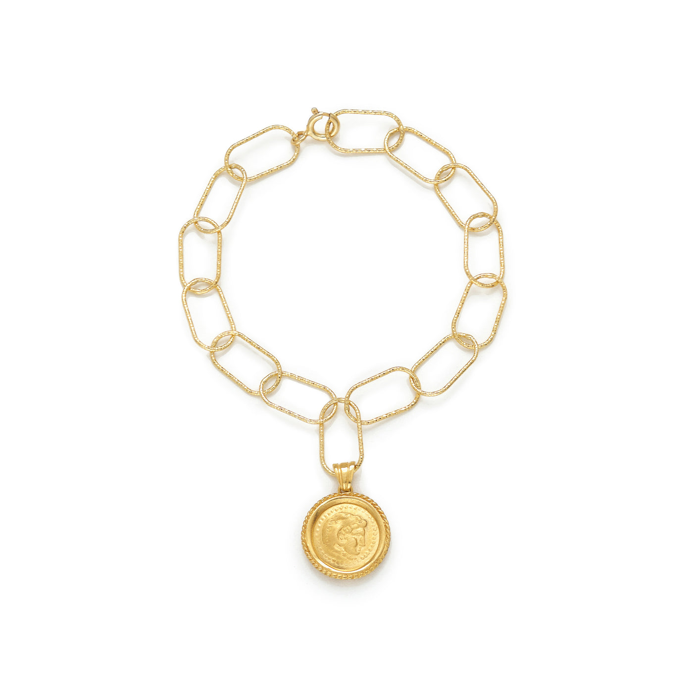 A delicate 18k gold plated bracelet, featuring a finely hammered coin medallion of 'Hercules' on a rolled link chain.The hero 'Hercules' symbolises strength in Greek mythology.