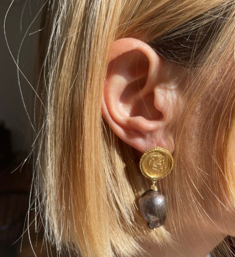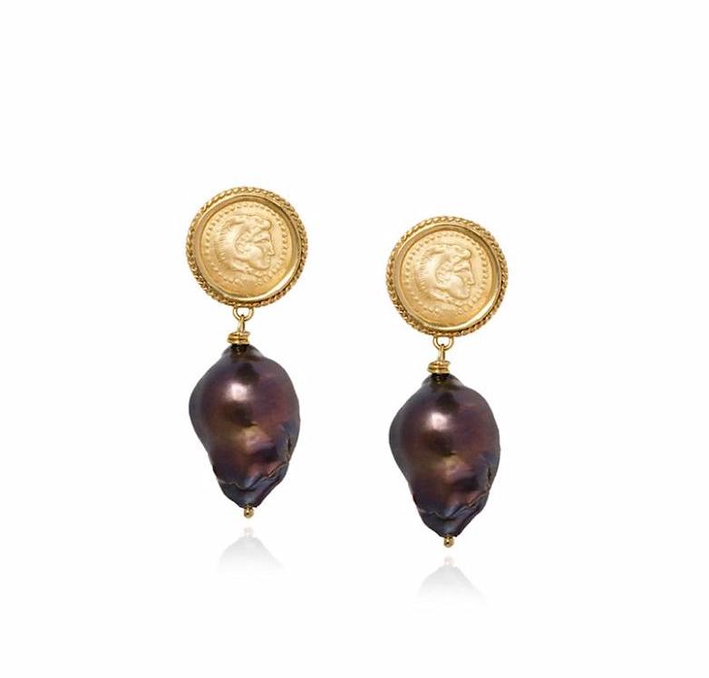 Beautiful large baroque pearl pin earrings topped with a finely hammered medallion featuring Hercules. Reverse is imprinted with Greek symbols typical of coins of the Alexander the Great era. The hero 'Hercules' symbolises strength in Greek mythology.