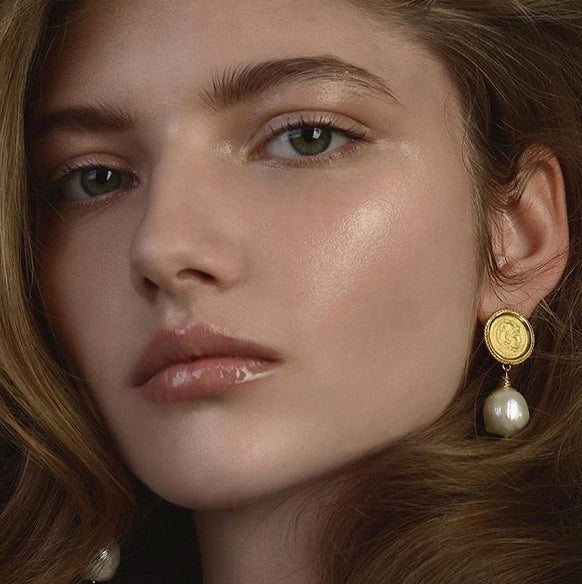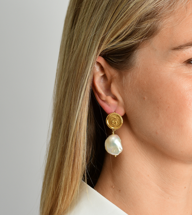 Beautiful large baroque pearl pin earrings topped with a finely hammered medallion featuring Hercules. Reverse is imprinted with Greek symbols typical of coins of the Alexander the Great era. The hero 'Hercules' symbolises strength in Greek mythology.