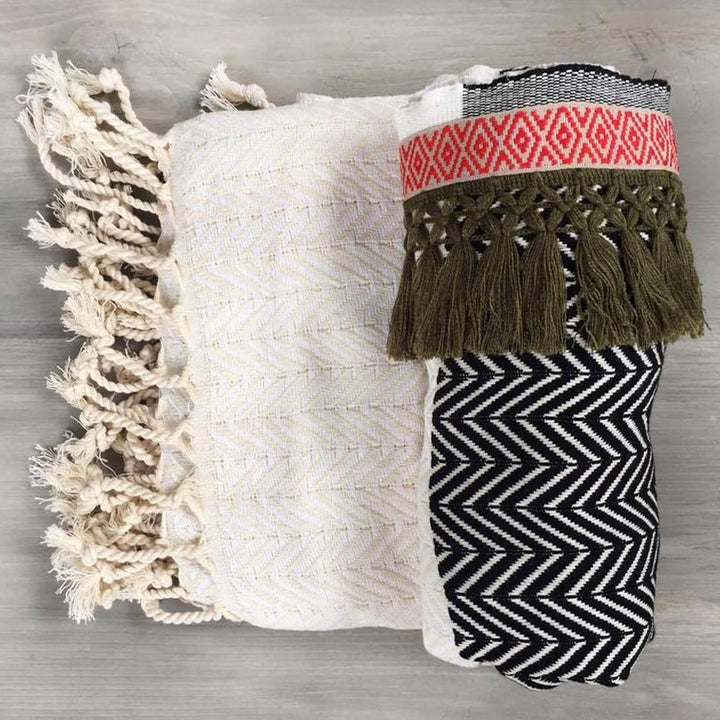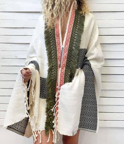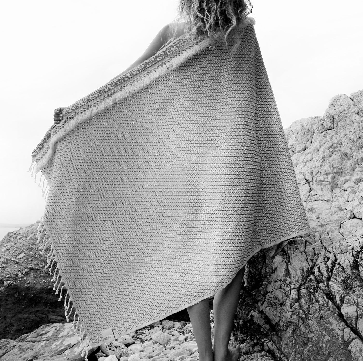 Make a stylish statement with this versatile thick tassled beach cover up. Use it as a towel and beach cape by day, and at sunset as scarf around your neck whilst sipping cocktails.
