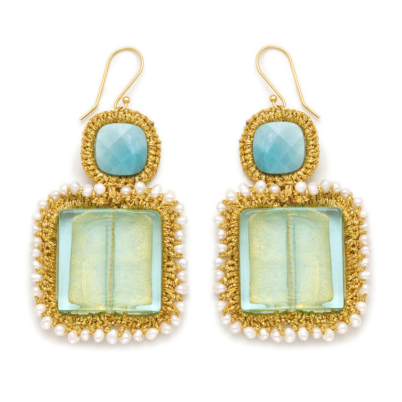 Statement earrings delicately framed with micro pearls and features a Murano stone encasing fine powder gold.