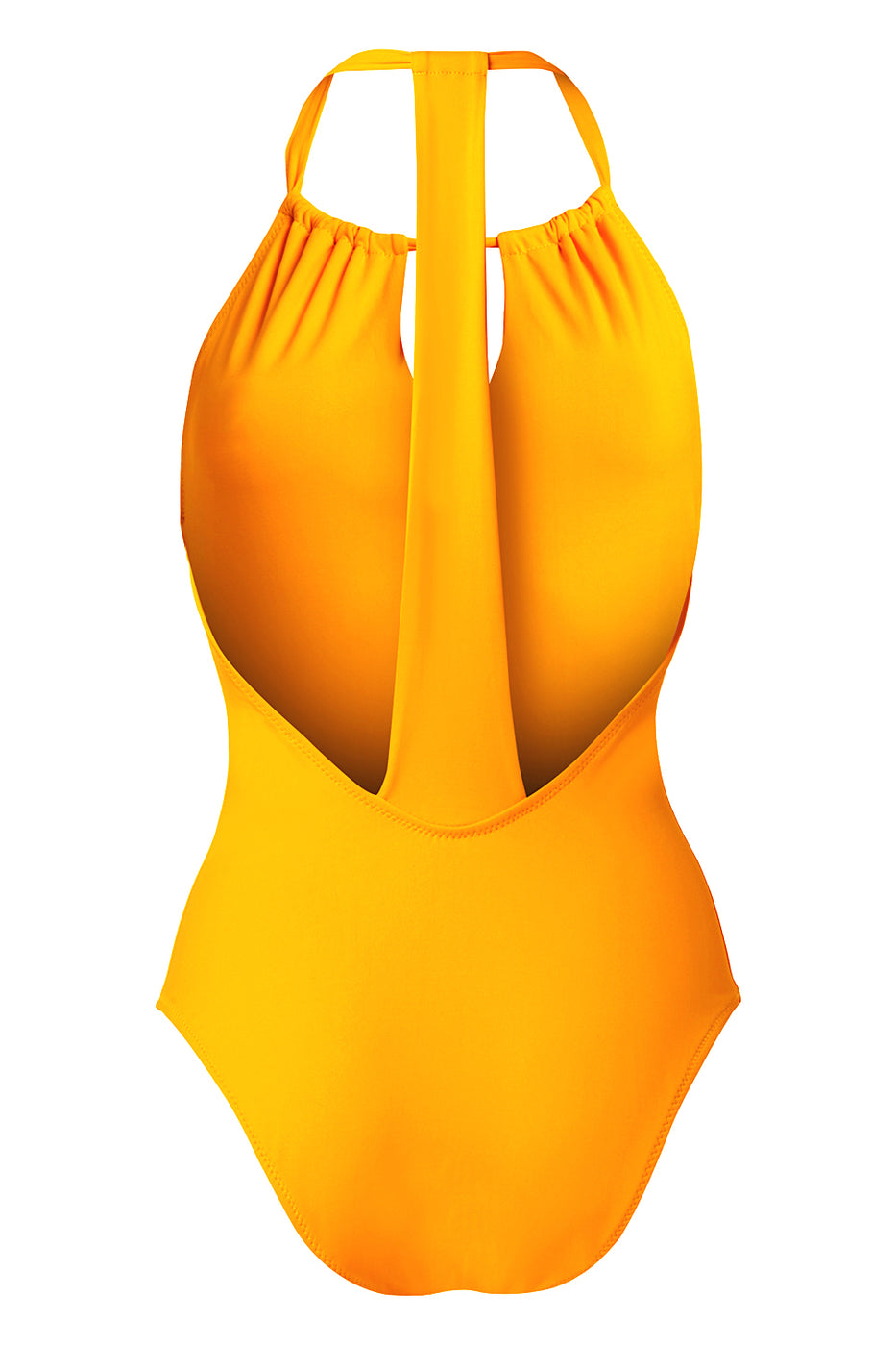 Classic tie-front one-piece with gathered peekaboo neckline. Back features a long vertical wide strap across the back. Very comfortable.