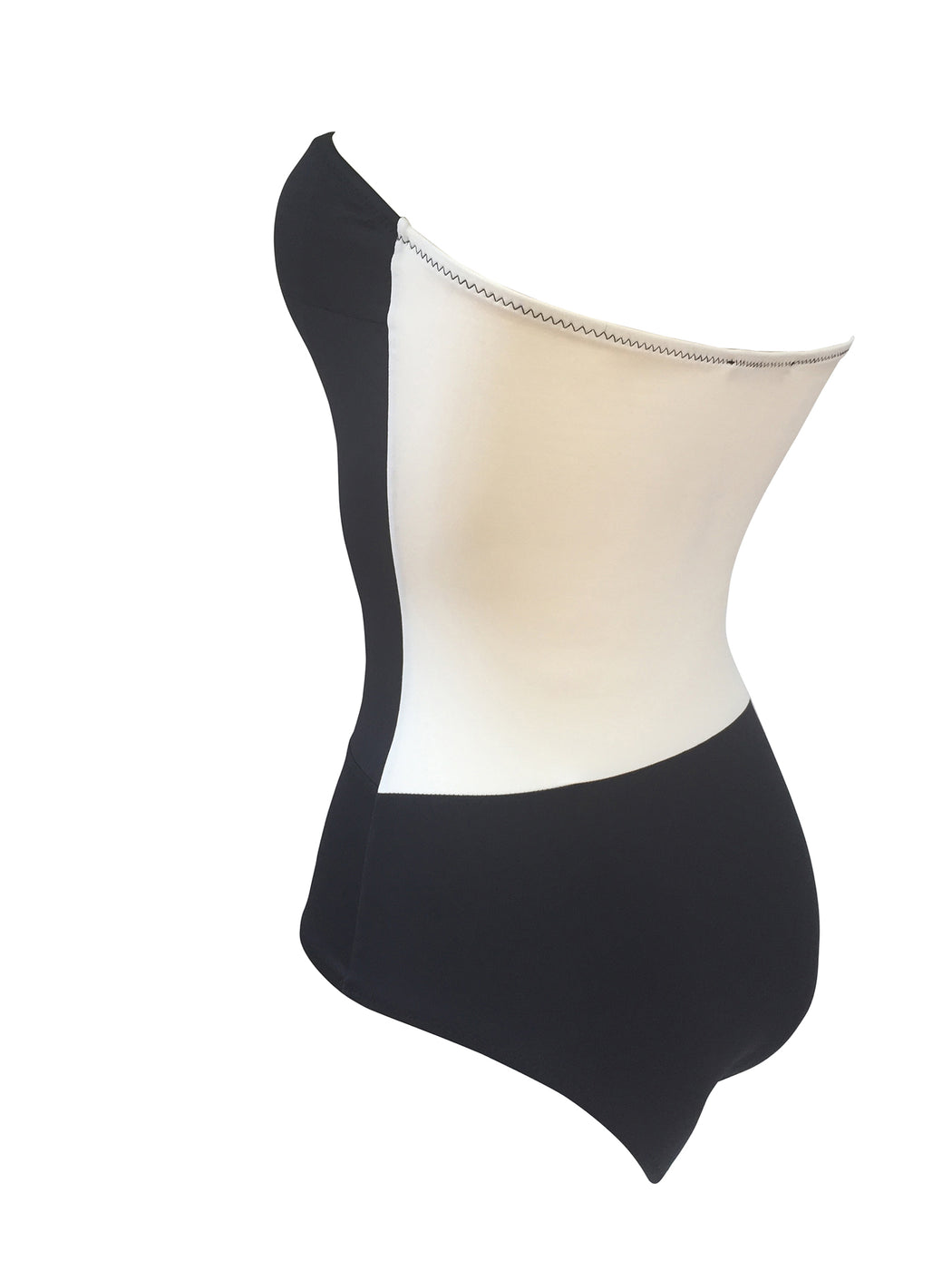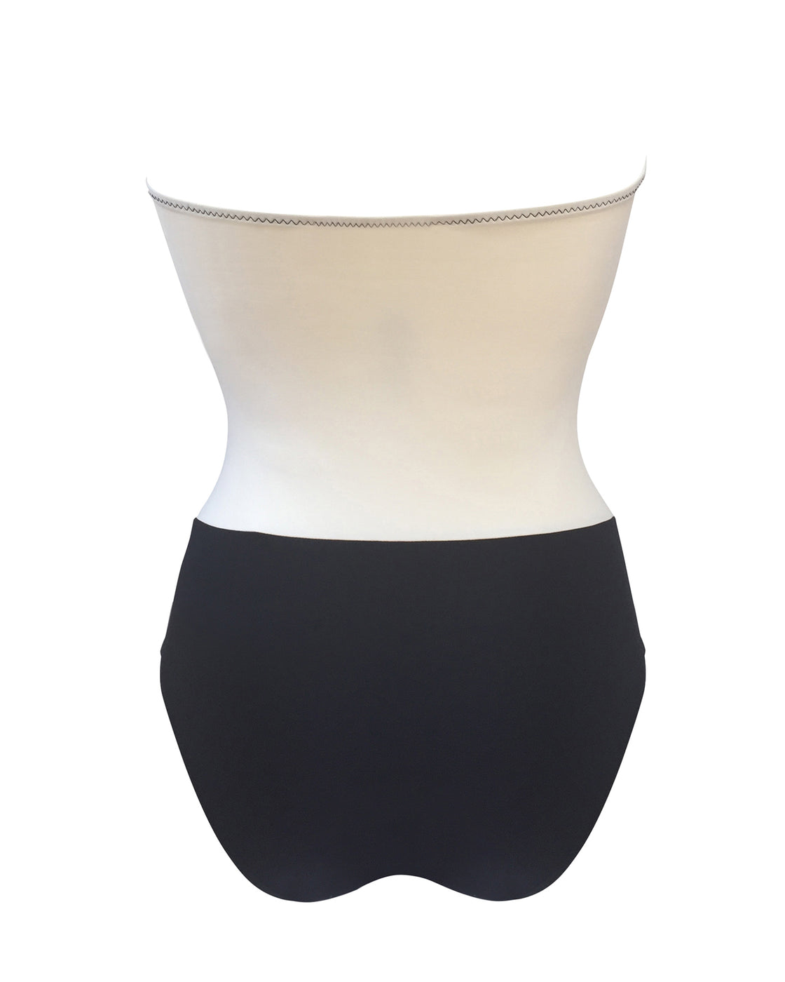 A truly elegant two-tone secure bandau one-piece. Decorative high-grade polished buttons.