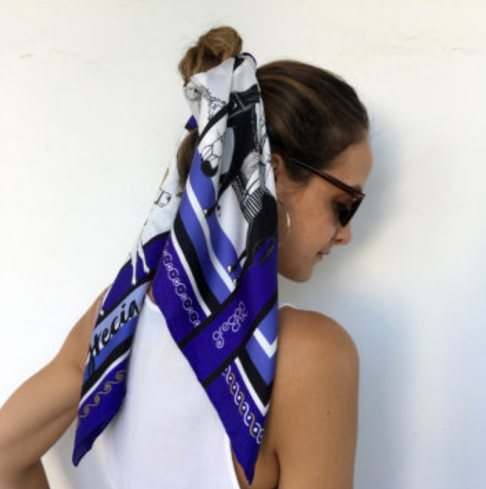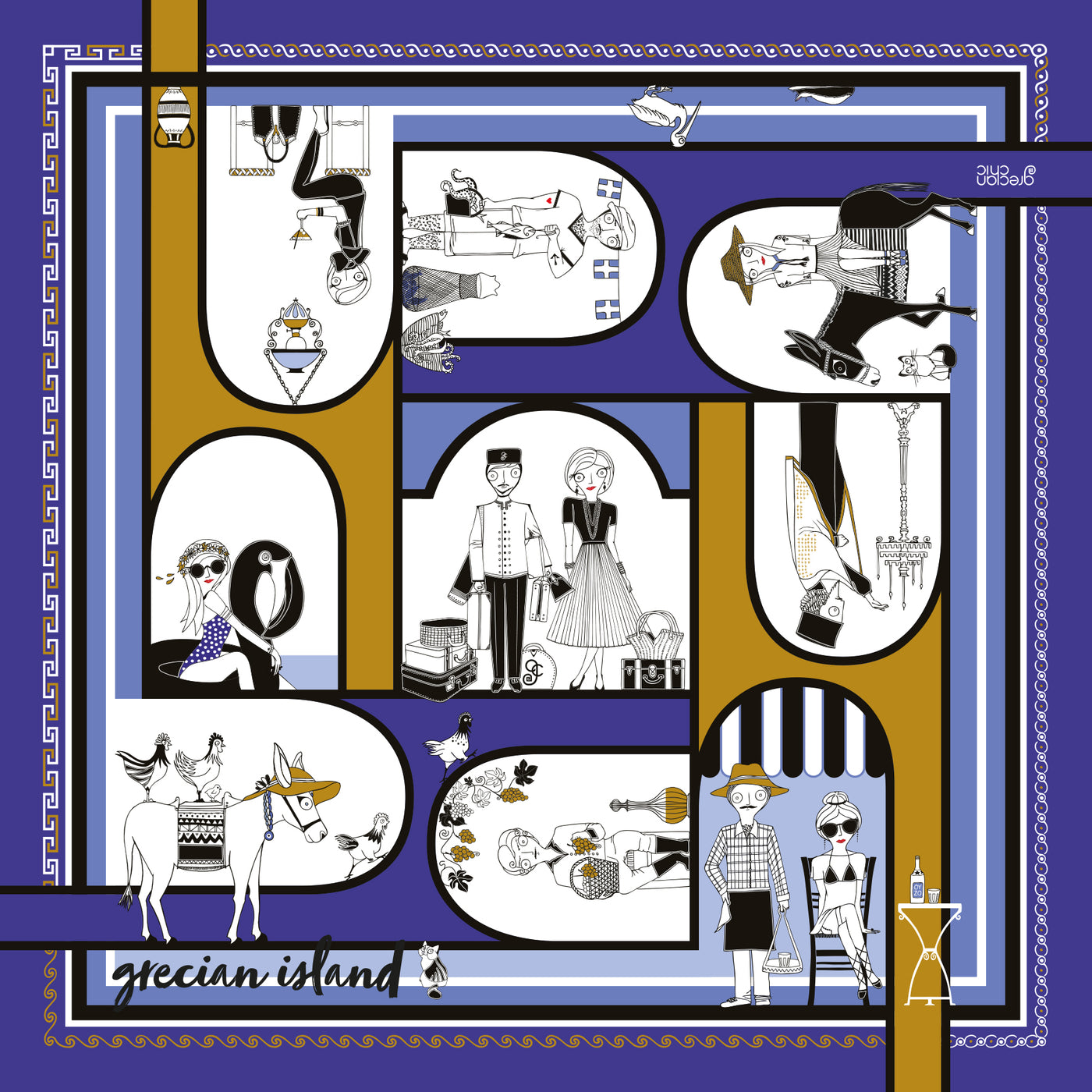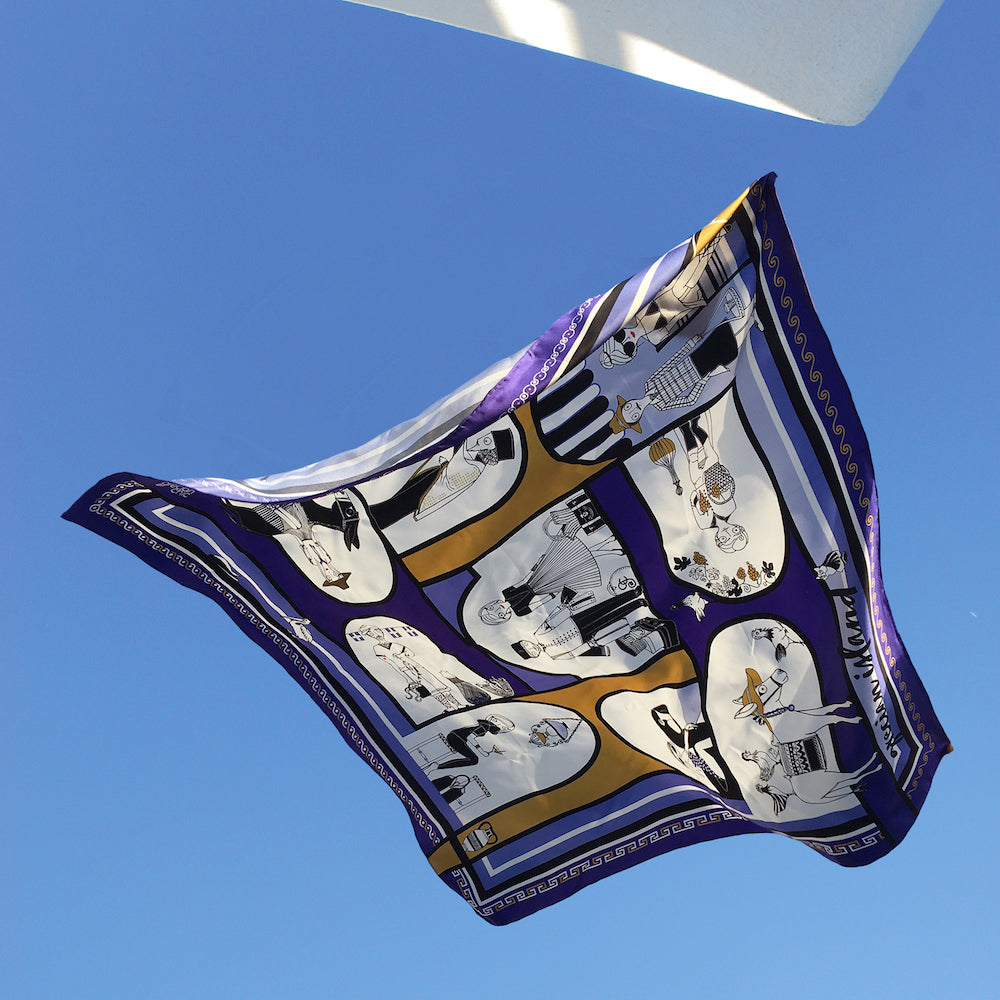 Grecian Chic Scarves are handmade fine silk scarves featuring, hand-illustrated comical motifs and cultural references.