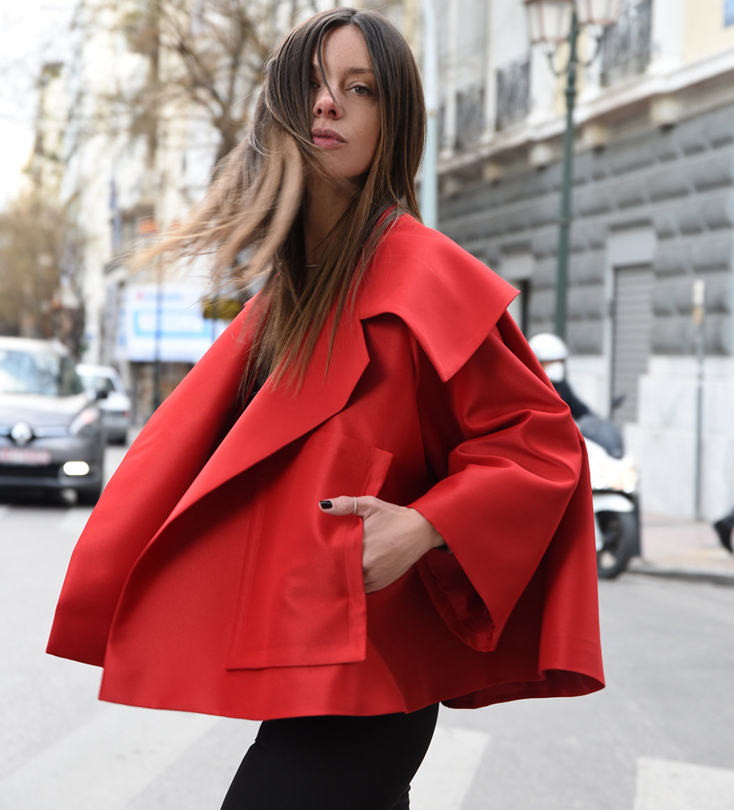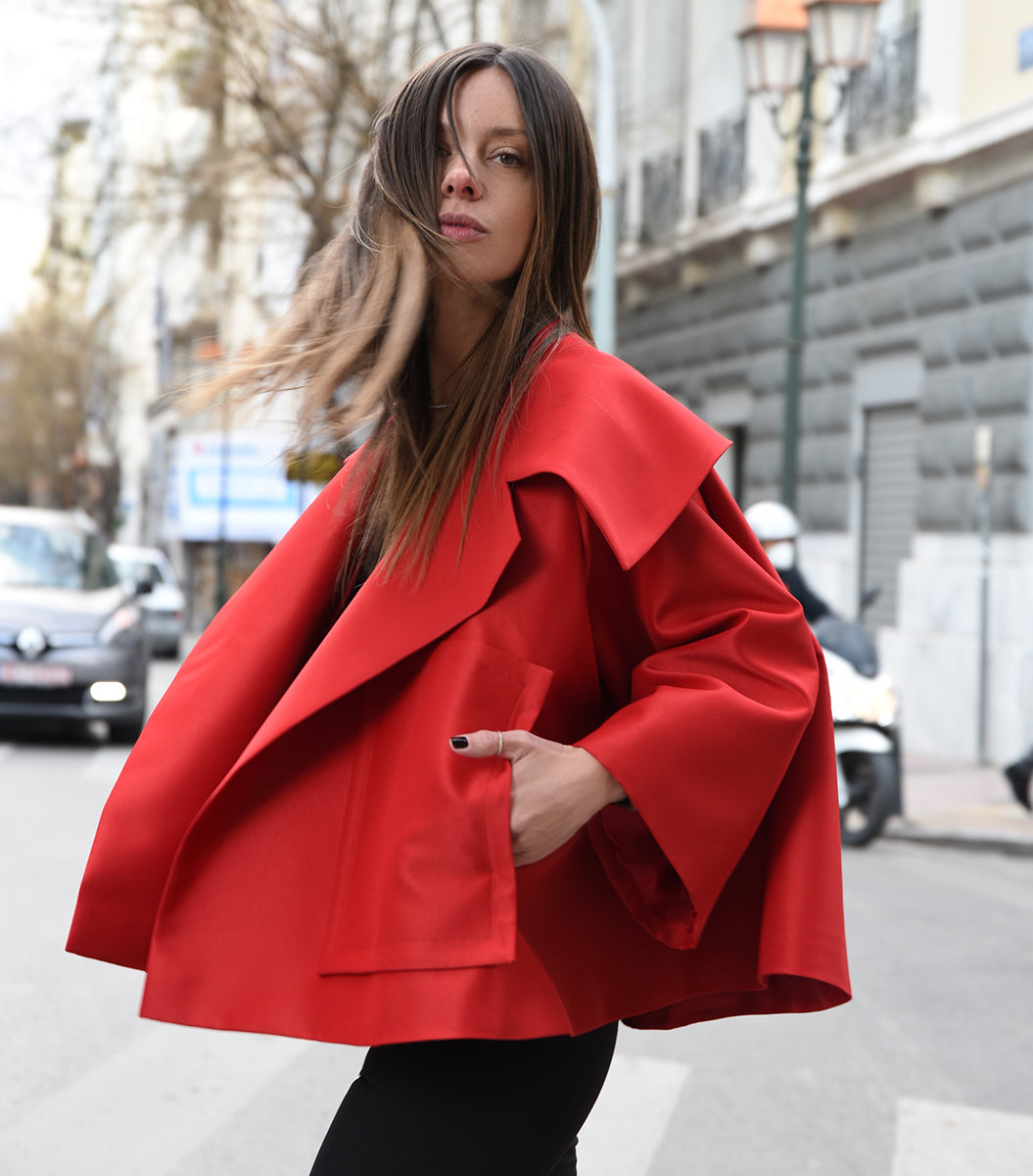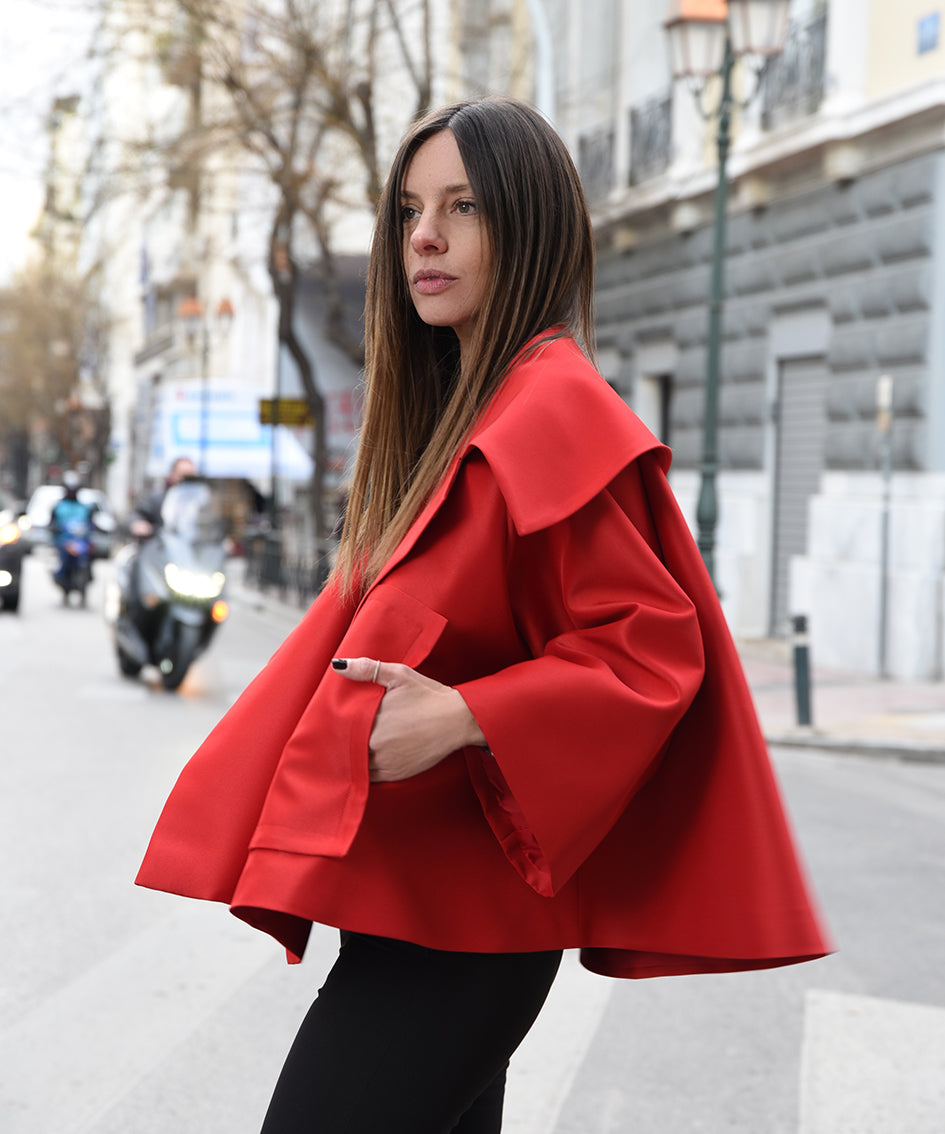 A modern take on the classic 1960's trapeze swing jacket. Lightweight, voluminous and features a super wide cape collar. It's cleverly cut so that it is flattering to all shapes. Wear it over jeans, skirt or dress. Make your statement!