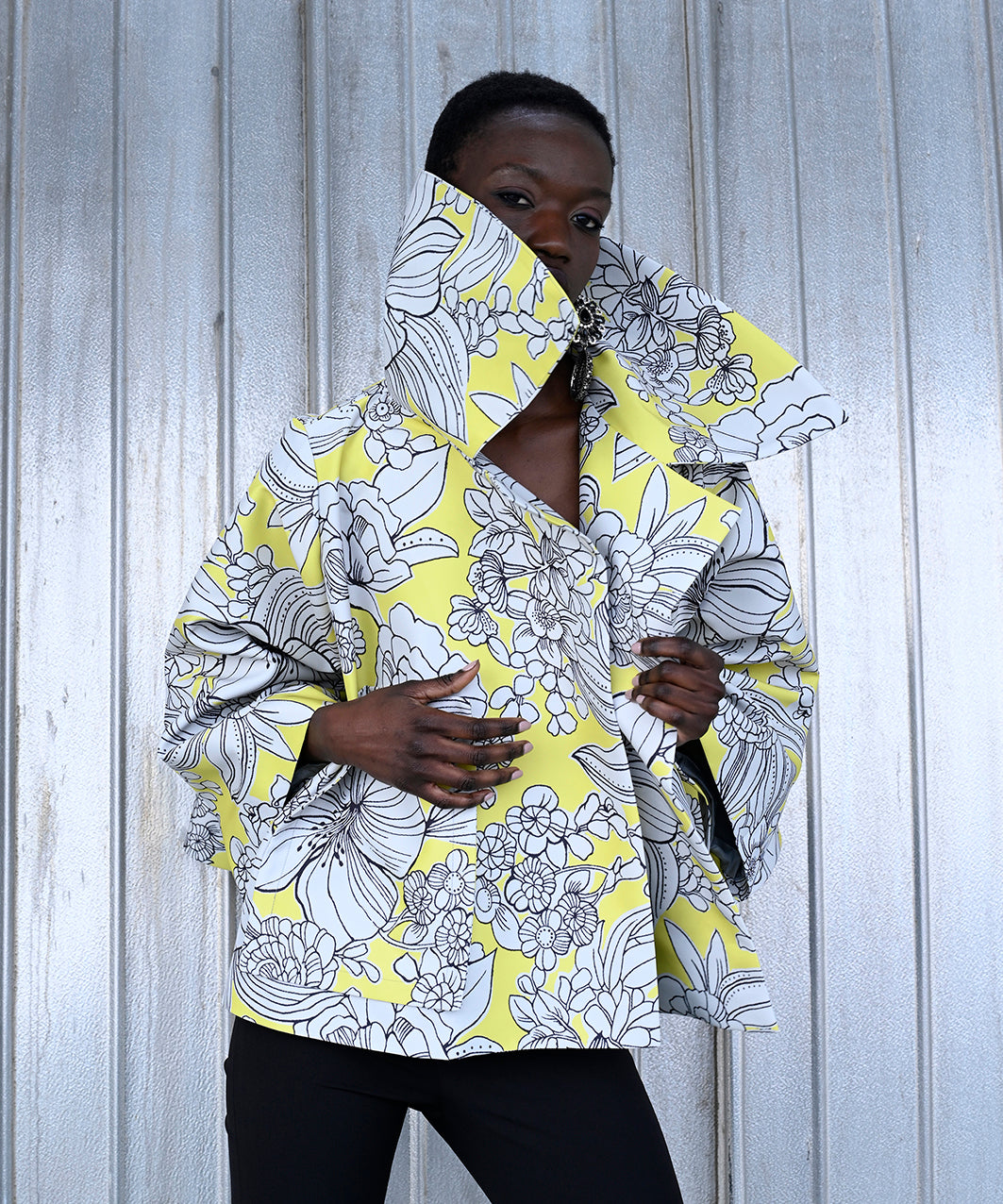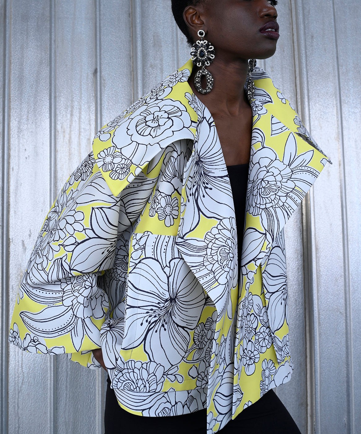 - Oversized lapel and collar.