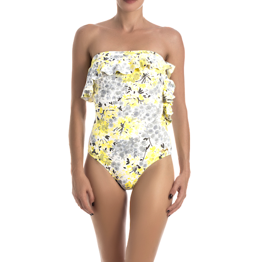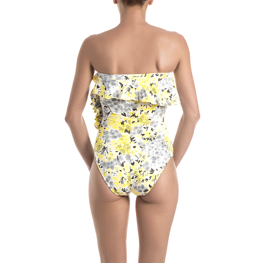 Secure bandeau one-piece featuring a floral array. Ruffled along back and front and one side. High cut at back. Full coverage.