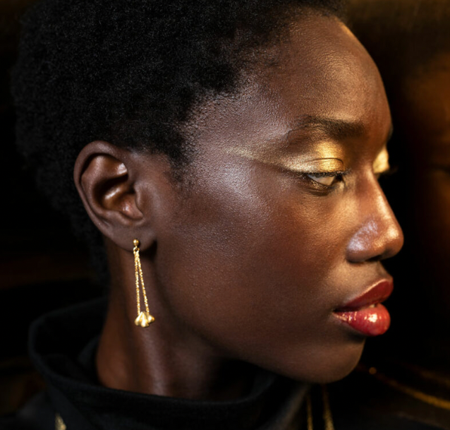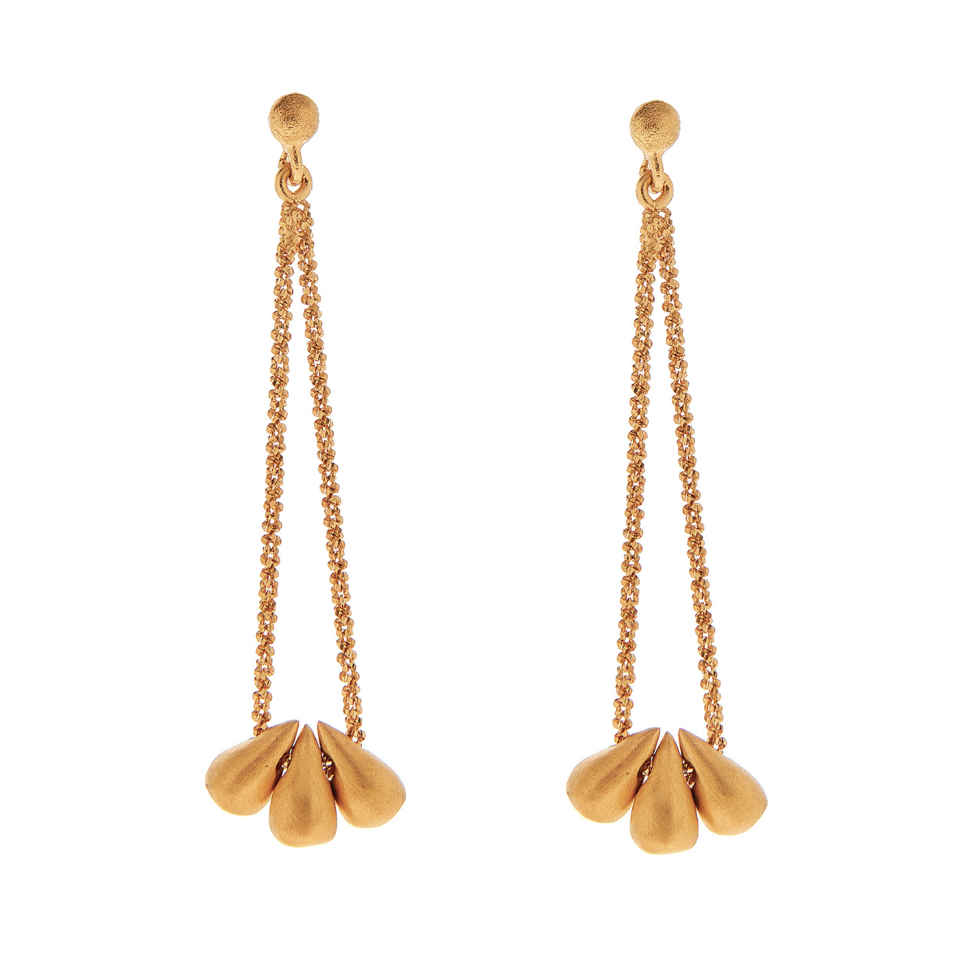 These delicate earrings feature a sparkling gold chain strands holding 3 solid drops.