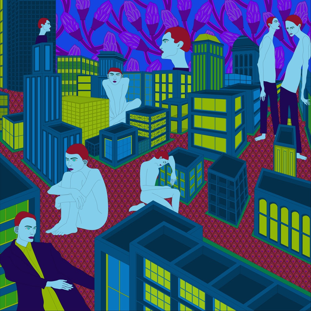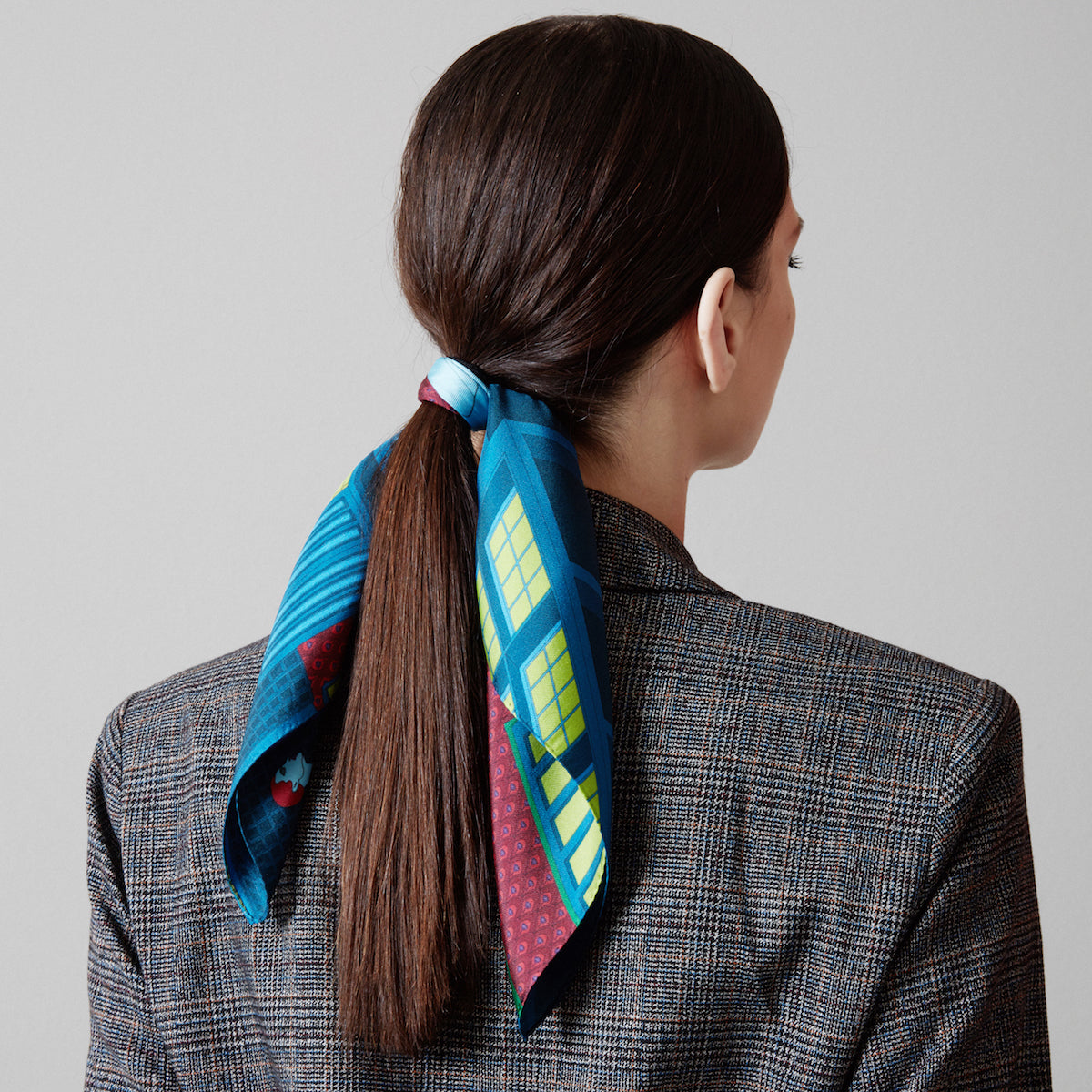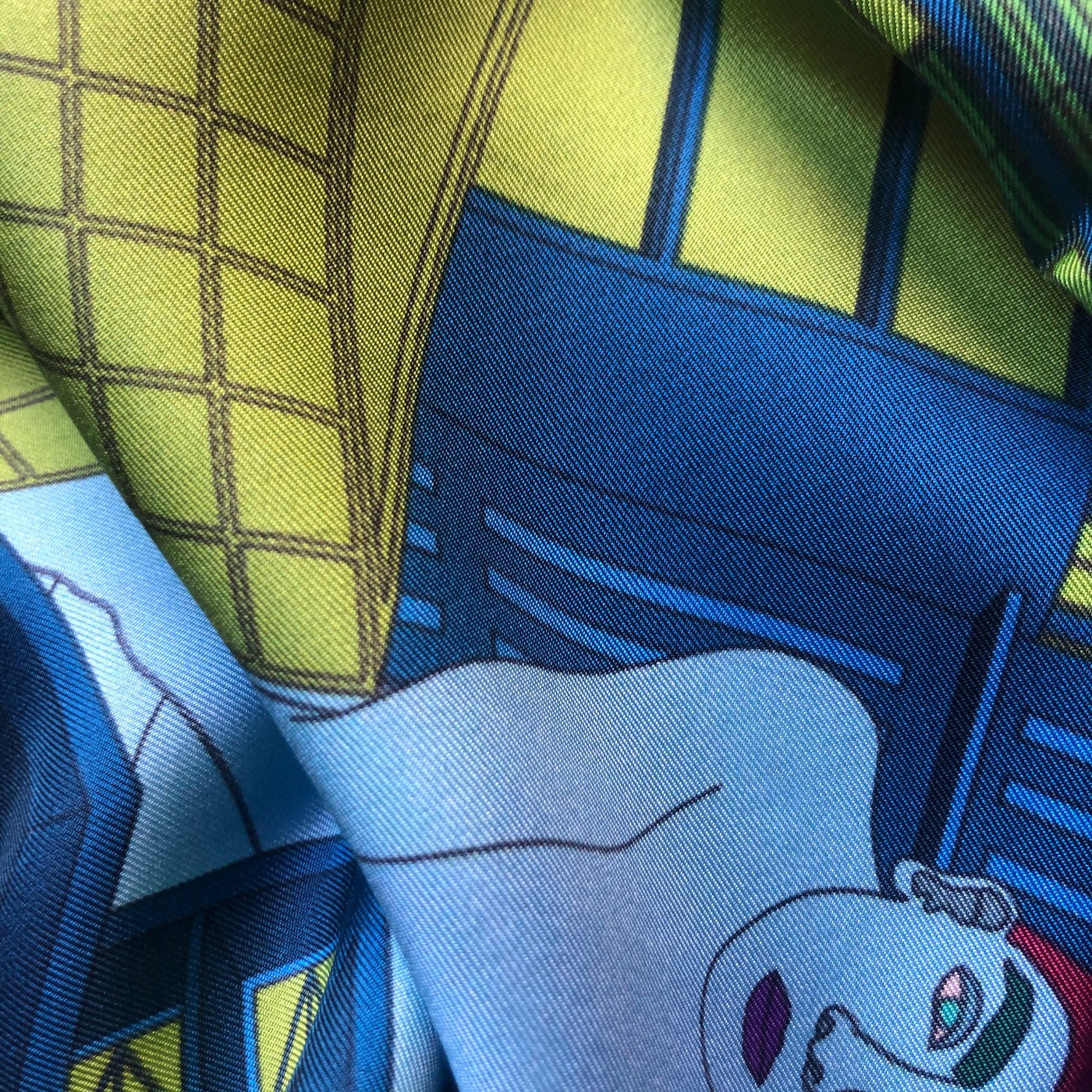 Premium 100% Silk, hand illustrated figurative artwork on a luxurious silk scarf. Artwork: Loneliness in a big city. , The designs are printed digitally and sewed traditionally by hand. This silk is sourced from natural silkworm cocoons within the 19th century old silk producing town called Soufli.