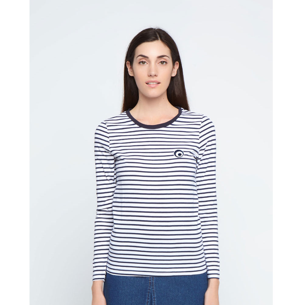 A classic Breton stripe long sleeve T-shirt. Made with a soft touch cotton and jersey mix and features an embroidered evil-eye.