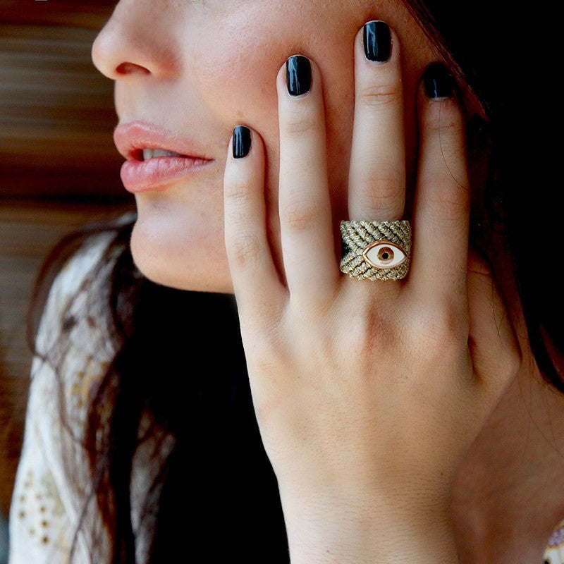 - Eye encased in gold-plated brass hand-stitched.