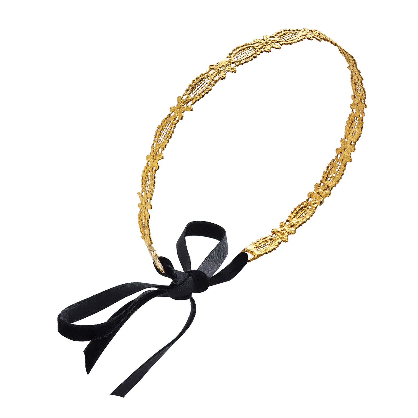 Handcrafted luxurious hammered gold narrow crown headband with floral lace effect.