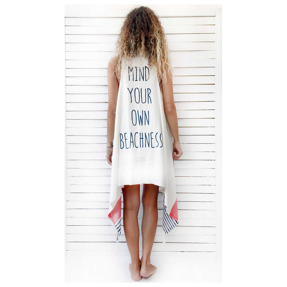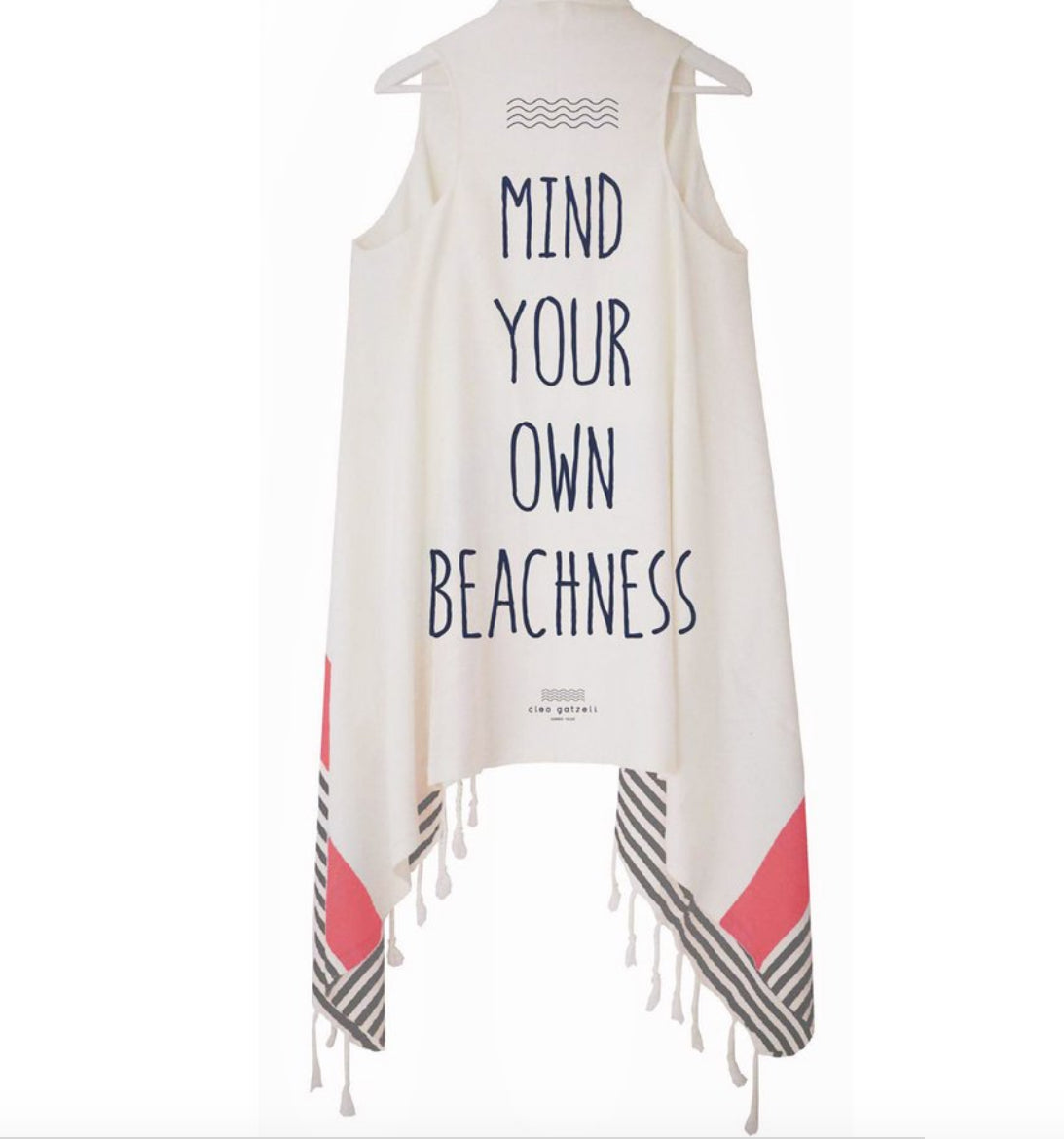 This lightweight striped "Mind Your Own Beachness" peshmetal fringed cover up can be worn as an open vest at the beach by day or wrapped with a belt for drinks.